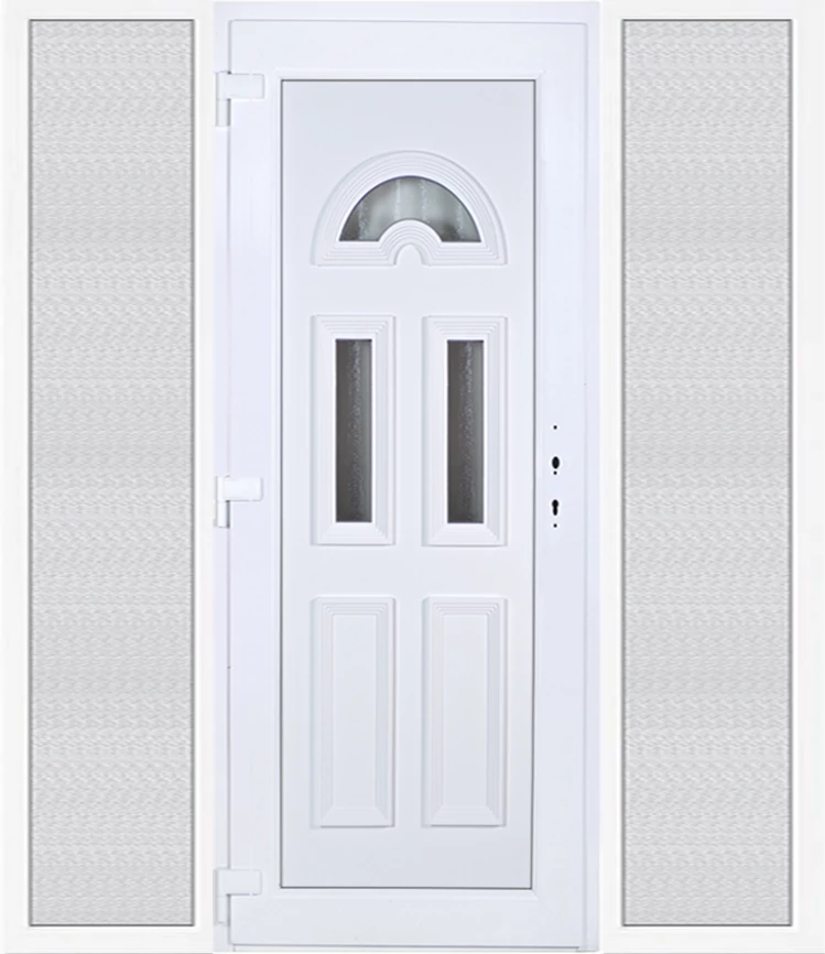 EXTRA hőszigetelésű műanyag bejárati ajtó 5 kamrás profilból, 70 mm beépítési mélységgel, tokban körbefutó idomacél merevítéssel. Vasalat: kilincsműködtetésű, 5 pontos ajtózárral, 3 db 3D erősített ajtópánttal, 20mm magas hőhídmentes alumínium küszöbbel, + 20mm purenittel a küszöb alatt. Dupla szürke ütközőtömítéssel rendelkezik. Üvegezése "savmart" katedrál 3 RÉTEGŰ Szuperlágybevonatos thermo üveg, 42 mm vastagságban, UG értéke: 0,7 W/m2K . A bejárati ajtó mindkét oldalán fehér színű. Nyitásmódja befelé nyíló, nyitásiránya balos ( bentről nézve a zsanér a bal oldalon helyezkedik el ). Tényleges tokkülmérete: 198 cm széles 209 cm magas. 98 cm széles 209 cm magas bejárati ajtóból, és 2 darab 50 cm széles 209 cm magas fix "savmart" üvegezésű ( nem nyitható) oldalvilágítóból áll. ( 3 külön elem ami beépítéskor összeszerelendő). A nyílászáró ára nem tartalmazza a KILINCSET és a ZÁRBETÉTET a beszereléshez szükséges segédanyagokat (falkampó, csavar, pur-hab..stb.), külső-belső takaróléceket.