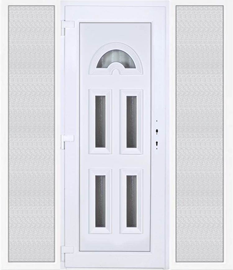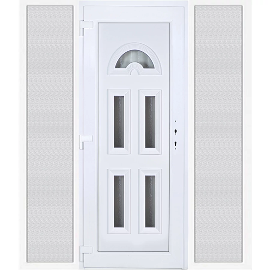 Kiváló hőszigetelésű műanyag bejárati ajtó 5 kamrás profilból, 70 mm beépítési mélységgel, tokban körbefutó idomacél merevítéssel. Vasalat: kilincsműködtetésű, 5 pontos ajtózárral, 3 db 3D erősített ajtópánttal, 35mm magas hőhídmentes alumínium küszöbbel. Dupla szürke ütközőtömítéssel rendelkezik. Üvegezése "GRÍZ" katedrál 2 rétegű Szuperlágybevonatos thermo üveg, 24 mm vastagságban, UG értéke: 1.0 W/m2K . A bejárati ajtó mindkét oldalán fehér színű. Nyitásmódja befelé nyíló, nyitásiránya balos ( bentről nézve a zsanér a bal oldalon helyezkedik el ). Tényleges tokkülmérete: 198 cm széles 208,5 cm magas. 98 cm széles 208,5 cm magas bejárati ajtóból, és 2 darab 50 cm széles 208,5 cm magas fix "GRÍZ" üvegezésű ( nem nyitható) oldalvilágítóból áll. ( 3 külön elem ami beépítéskor összeszerelendő). A nyílászáró ára nem tartalmazza a KILINCSET és a ZÁRBETÉTET a beszereléshez szükséges segédanyagokat (falkampó, csavar, pur-hab..stb.), külső-belső takaróléceket.