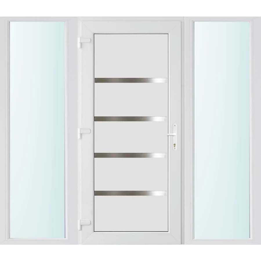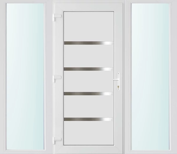 Kiváló hőszigetelésű műanyag bejárati ajtó 5 kamrás Pro line profilból, 70 mm beépítési mélységgel, tokban körbefutó idomacél merevítéssel. Vasalat: kilincsműködtetésű, VORNE 5 pontos ajtózárral, 3 db 3D erősített ajtópánttal, 20mm magas hőhídmentes alumínium küszöbbel. Dupla szürke ütközőtömítéssel rendelkezik. Üvegezése "SAVMART" katedrál 3 rétegű Szuperlágybevonatos thermo üveg, 40 mm vastagságban, UG értéke: 0.7 W/m2K . A bejárati ajtó mindkét oldalán fehér színű. Nyitásmódja befelé nyíló, nyitásiránya balos ( bentről nézve a zsanér a bal oldalon helyezkedik el ). Tényleges tokkülmérete: 198 cm széles 208 cm magas A nyílászáró ára nem tartalmazza a KILINCSET és a ZÁRBETÉTET a beszereléshez szükséges segédanyagokat (falkampó, csavar, pur-hab..stb.), külső-belső takaróléceket.