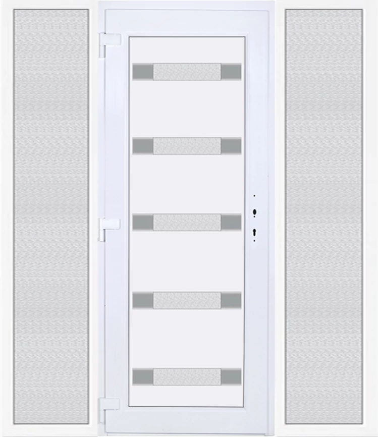 Kiváló hőszigetelésű műanyag bejárati ajtó 5 kamrás profilból, 70 mm beépítési mélységgel, tokban körbefutó idomacél merevítéssel. Vasalat: kilincsműködtetésű, 5 pontos ajtózárral, 3 db 3D erősített ajtópánttal, 35mm magas hőhídmentes alumínium küszöbbel. Dupla szürke ütközőtömítéssel rendelkezik. Üvegezése "GRÍZ" katedrál 2 rétegű Szuperlágybevonatos thermo üveg, 24 mm vastagságban, UG értéke: 1.0 W/m2K . A bejárati ajtó mindkét oldalán fehér színű. Nyitásmódja befelé nyíló, nyitásiránya balos ( bentről nézve a zsanér a bal oldalon helyezkedik el ). Tényleges tokkülmérete: 198 cm széles 208,5 cm magas. 98 cm széles 208,5 cm magas bejárati ajtóból, és 2 darab 50 cm széles 208,5 cm magas fix "GRÍZ" üvegezésű ( nem nyitható) oldalvilágítóból áll. ( 3 külön elem ami beépítéskor összeszerelendő). A nyílászáró ára nem tartalmazza a KILINCSET és a ZÁRBETÉTET a beszereléshez szükséges segédanyagokat (falkampó, csavar, pur-hab..stb.), külső-belső takaróléceket.