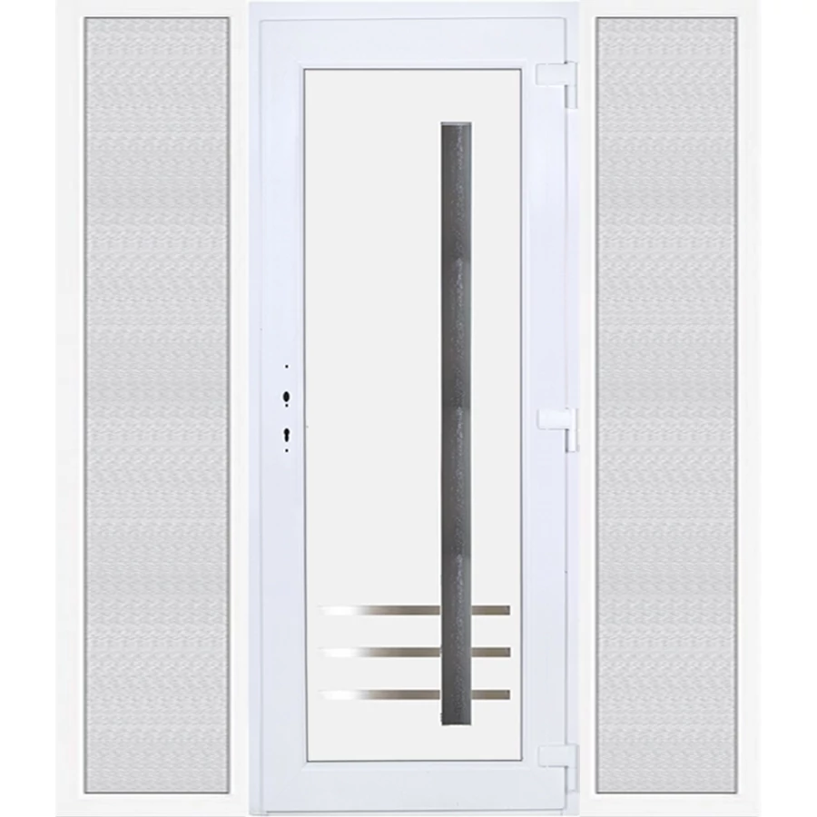 EXTRA hőszigetelésű műanyag bejárati ajtó 5 kamrás profilból, 70 mm beépítési mélységgel, tokban körbefutó idomacél merevítéssel. Vasalat: kilincsműködtetésű, 5 pontos ajtózárral, 3 db 3D erősített ajtópánttal, 20mm magas hőhídmentes alumínium küszöbbel, + 20mm purenittel a küszöb alatt. Dupla szürke ütközőtömítéssel rendelkezik. Üvegezése "savmart" katedrál 3 RÉTEGŰ Szuperlágybevonatos thermo üveg, 42 mm vastagságban, UG értéke: 0,7 W/m2K . A bejárati ajtó mindkét oldalán fehér színű. Nyitásmódja befelé nyíló, nyitásiránya jobbos ( bentről nézve a zsanér a jobb oldalon helyezkedik el ). Tényleges tokkülmérete: 198 cm széles 209 cm magas. 98 cm széles 209 cm magas bejárati ajtóból, és 2 darab 50 cm széles 209 cm magas fix "savmart" üvegezésű ( nem nyitható) oldalvilágítóból áll. ( 3 külön elem ami beépítéskor összeszerelendő). A nyílászáró ára nem tartalmazza a KILINCSET és a ZÁRBETÉTET a beszereléshez szükséges segédanyagokat (falkampó, csavar, pur-hab..stb.), külső-belső takaróléceket.