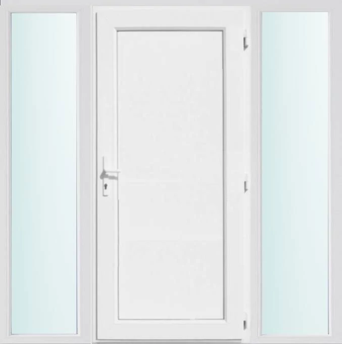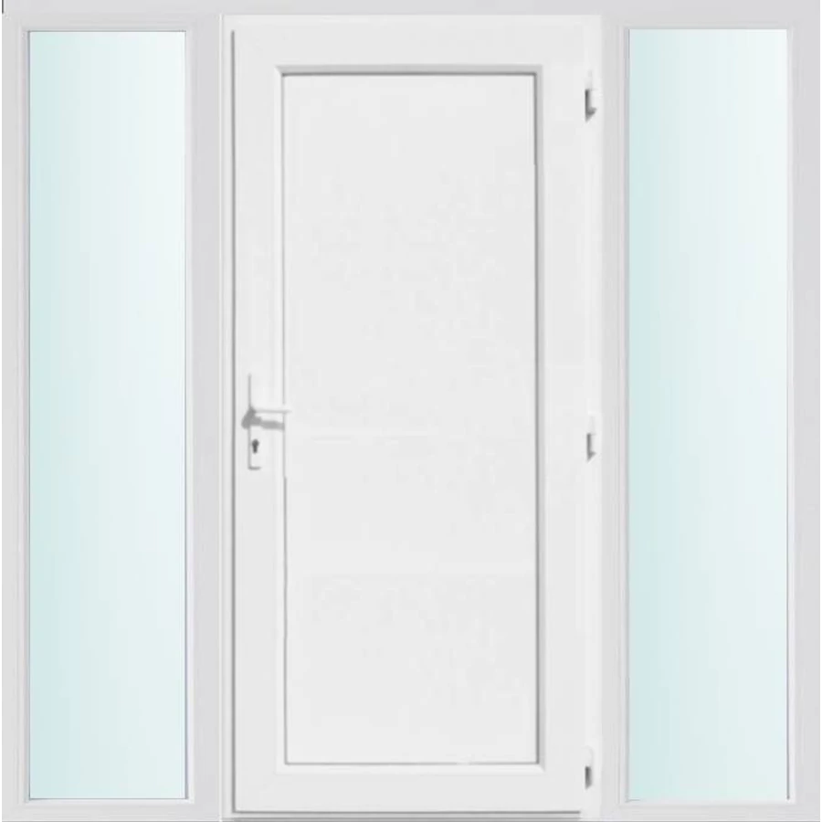 Kiváló hőszigetelésű műanyag bejárati ajtó 5 kamrás profilból, 70 mm beépítési mélységgel, tokban körbefutó idomacél merevítéssel. Vasalat: kilincsműködtetésű, VORNE 5 pontos ajtózárral, 3 db 3D erősített ajtópánttal, 20mm magas hőhídmentes alumínium küszöbbel. Dupla szürke ütközőtömítéssel rendelkezik. Üvegezése "SAVMART" katedrál 2 rétegű Szuperlágybevonatos thermo üveg, 24 mm vastagságban, UG értéke: 1.0 W/m2K . A bejárati ajtó mindkét oldalán fehér színű. Nyitásmódja befelé nyíló, nyitásiránya jobbos ( bentről nézve a zsanér a jobb oldalon helyezkedik el ). Tényleges tokkülmérete: 198 cm széles 208 cm magas. 98 cm széles 208 cm magas bejárati ajtóból, és 2 darab 50 cm széles 208 cm magas fix "SAVMART" üvegezésű ( nem nyitható) oldalvilágítóból áll. ( 3 külön elem ami beépítéskor összeszerelendő). A nyílászáró ára nem tartalmazza a KILINCSET és a ZÁRBETÉTET a beszereléshez szükséges segédanyagokat (falkampó, csavar, pur-hab..stb.), külső-belső takaróléceket.