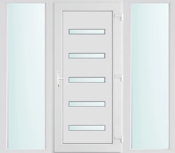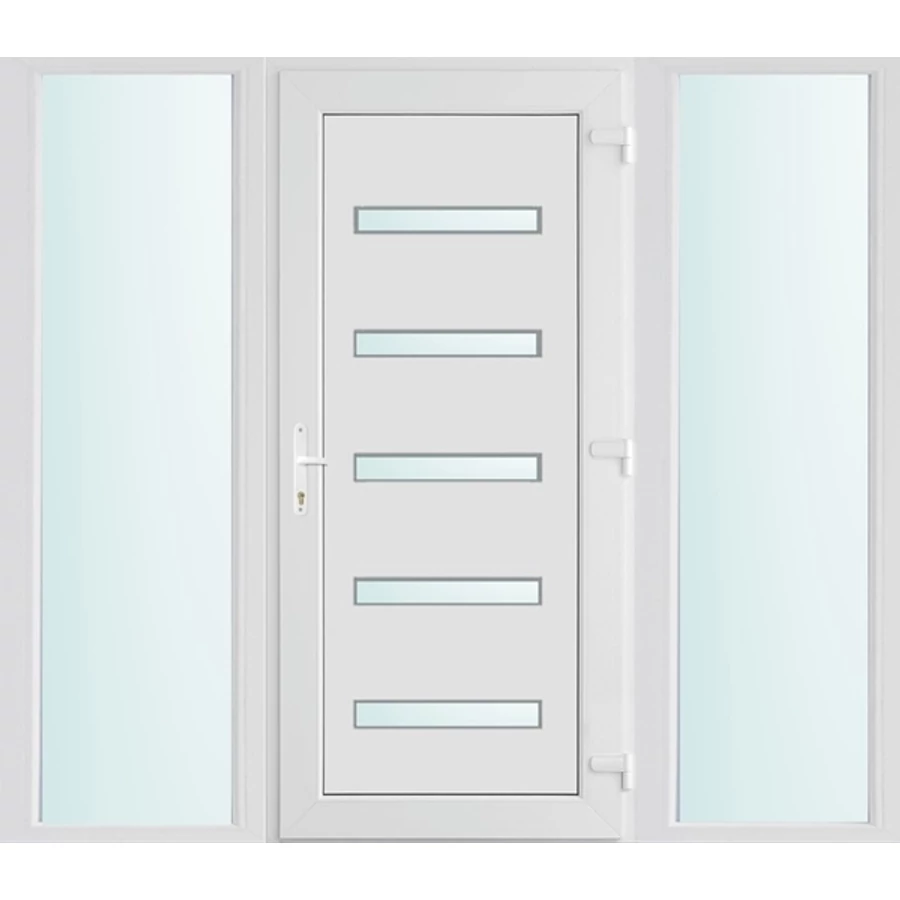 Kiváló hőszigetelésű műanyag bejárati ajtó 5 kamrás profilból, 70 mm beépítési mélységgel, tokban körbefutó idomacél merevítéssel. Vasalat: kilincsműködtetésű, VORNE 5 pontos ajtózárral, 3 db 3D erősített ajtópánttal, 20mm magas hőhídmentes alumínium küszöbbel. Dupla szürke ütközőtömítéssel rendelkezik. Üvegezése "SAVMART" katedrál 2 rétegű Szuperlágybevonatos thermo üveg, 24 mm vastagságban, UG értéke: 1.0 W/m2K . A bejárati ajtó mindkét oldalán fehér színű. Nyitásmódja befelé nyíló, nyitásiránya jobbos ( bentről nézve a zsanér a jobb oldalon helyezkedik el ). Tényleges tokkülmérete: 198 cm széles 208 cm magas. 98 cm széles 208 cm magas bejárati ajtóból, és 2 darab 50 cm széles 208 cm magas fix "SAVMART" üvegezésű ( nem nyitható) oldalvilágítóból áll. ( 3 külön elem ami beépítéskor összeszerelendő). A nyílászáró ára nem tartalmazza a KILINCSET és a ZÁRBETÉTET a beszereléshez szükséges segédanyagokat (falkampó, csavar, pur-hab..stb.), külső-belső takaróléceket.
