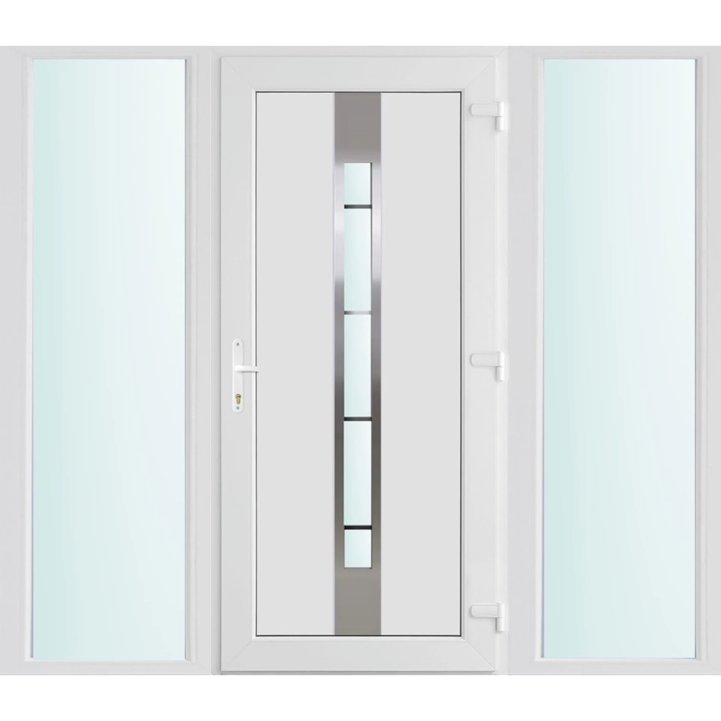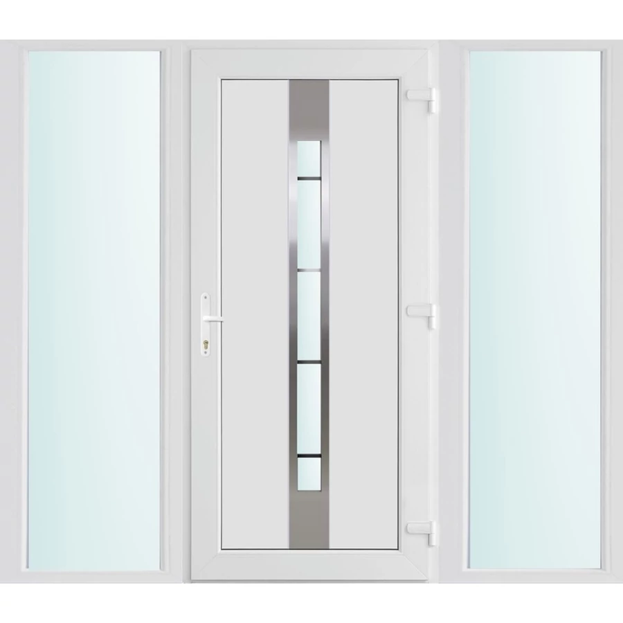 Kiváló hőszigetelésű műanyag bejárati ajtó 5 kamrás Pro line profilból, 70 mm beépítési mélységgel, tokban körbefutó idomacél merevítéssel. Vasalat: kilincsműködtetésű, VORNE 5 pontos ajtózárral, 3 db 3D erősített ajtópánttal, 20mm magas hőhídmentes alumínium küszöbbel. Dupla szürke ütközőtömítéssel rendelkezik. Üvegezése "SAVMART" katedrál 3 rétegű Szuperlágybevonatos thermo üveg, 40 mm vastagságban, UG értéke: 0.7 W/m2K . A bejárati ajtó mindkét oldalán fehér színű. Nyitásmódja befelé nyíló, nyitásiránya jobbos ( bentről nézve a zsanér a bal oldalon helyezkedik el ). Tényleges tokkülmérete: 198 cm széles 208 cm magas A nyílászáró ára nem tartalmazza a KILINCSET és a ZÁRBETÉTET a beszereléshez szükséges segédanyagokat (falkampó, csavar, pur-hab..stb.), külső-belső takaróléceket.