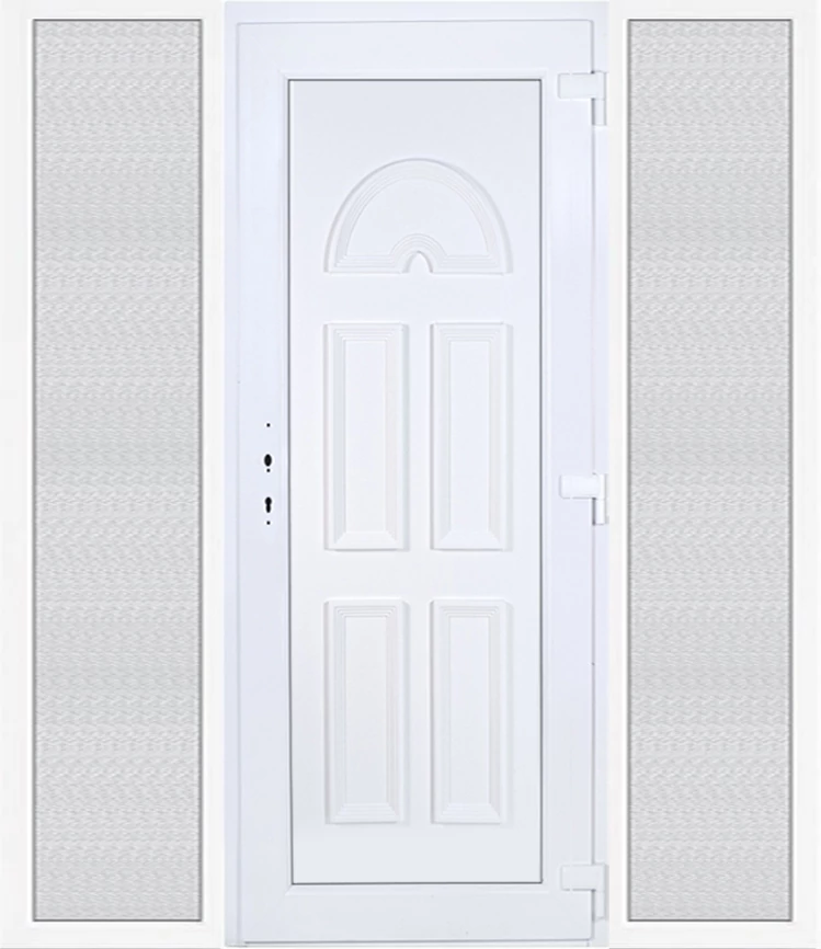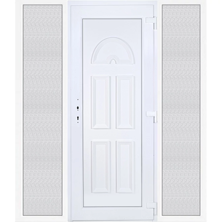 Kiváló hőszigetelésű műanyag bejárati ajtó 5 kamrás profilból, 70 mm beépítési mélységgel, tokban körbefutó idomacél merevítéssel. Vasalat: kilincsműködtetésű, 5 pontos ajtózárral, 3 db 3D erősített ajtópánttal, 35mm magas hőhídmentes alumínium küszöbbel. Dupla szürke ütközőtömítéssel rendelkezik. Üvegezése "GRÍZ" katedrál 2 rétegű Szuperlágybevonatos thermo üveg, 24 mm vastagságban, UG értéke: 1.0 W/m2K . A bejárati ajtó mindkét oldalán fehér színű. Nyitásmódja befelé nyíló, nyitásiránya jobbos ( bentről nézve a zsanér a jobb oldalon helyezkedik el ). Tényleges tokkülmérete: 198 cm széles 208,5 cm magas. 98 cm széles 208,5 cm magas bejárati ajtóból, és 2 darab 50 cm széles 208,5 cm magas fix "GRÍZ" üvegezésű ( nem nyitható) oldalvilágítóból áll. ( 3 külön elem ami beépítéskor összeszerelendő). A nyílászáró ára nem tartalmazza a KILINCSET és a ZÁRBETÉTET a beszereléshez szükséges segédanyagokat (falkampó, csavar, pur-hab..stb.), külső-belső takaróléceket.