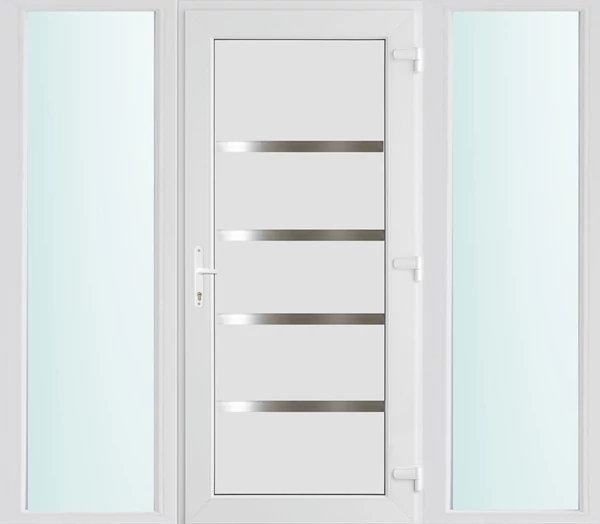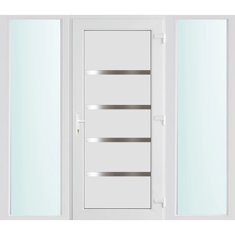 Kiváló hőszigetelésű műanyag bejárati ajtó 5 kamrás profilból, 70 mm beépítési mélységgel, tokban körbefutó idomacél merevítéssel. Vasalat: kilincsműködtetésű, VORNE 5 pontos ajtózárral, 3 db 3D erősített ajtópánttal, 20mm magas hőhídmentes alumínium küszöbbel. Dupla szürke ütközőtömítéssel rendelkezik. Üvegezése "SAVMART" katedrál 2 rétegű Szuperlágybevonatos thermo üveg, 24 mm vastagságban, UG értéke: 1.0 W/m2K . A bejárati ajtó mindkét oldalán fehér színű. Nyitásmódja befelé nyíló, nyitásiránya jobbos ( bentről nézve a zsanér a jobb oldalon helyezkedik el ). Tényleges tokkülmérete: 198 cm széles 208 cm magas. 98 cm széles 208 cm magas bejárati ajtóból, és 2 darab 50 cm széles 208 cm magas fix "SAVMART" üvegezésű ( nem nyitható) oldalvilágítóból áll. ( 3 külön elem ami beépítéskor összeszerelendő). A nyílászáró ára nem tartalmazza a KILINCSET és a ZÁRBETÉTET a beszereléshez szükséges segédanyagokat (falkampó, csavar, pur-hab..stb.), külső-belső takaróléceket.