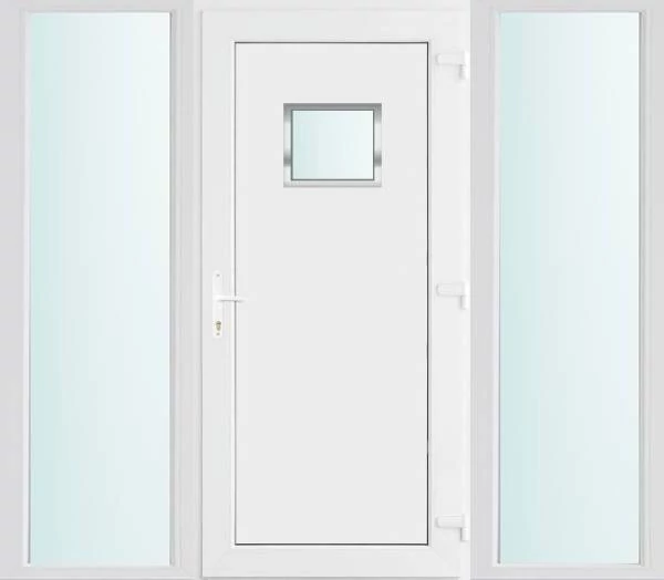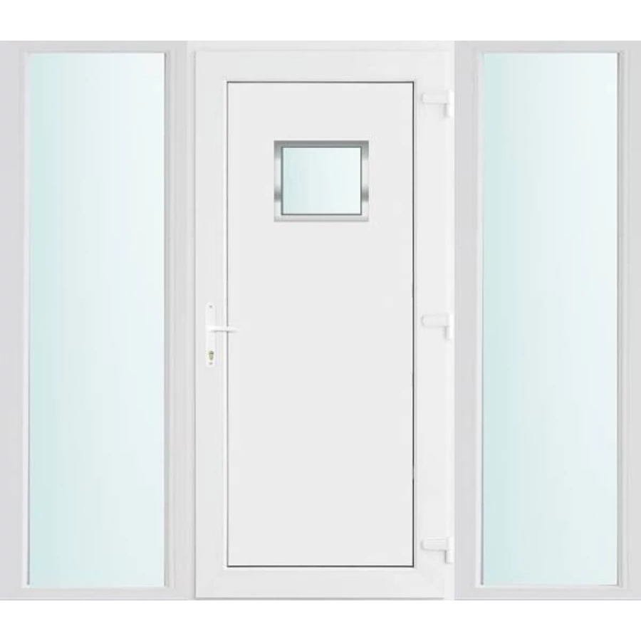 Kiváló hőszigetelésű műanyag bejárati ajtó 5 kamrás profilból, 70 mm beépítési mélységgel, tokban körbefutó idomacél merevítéssel. Vasalat: kilincsműködtetésű, VORNE 5 pontos ajtózárral, 3 db 3D erősített ajtópánttal, 20mm magas hőhídmentes alumínium küszöbbel. Dupla szürke ütközőtömítéssel rendelkezik. Üvegezése "SAVMART" katedrál 2 rétegű Szuperlágybevonatos thermo üveg, 24 mm vastagságban, UG értéke: 1.0 W/m2K . A bejárati ajtó mindkét oldalán fehér színű. Nyitásmódja befelé nyíló, nyitásiránya jobbos ( bentről nézve a zsanér a jobb oldalon helyezkedik el ). Tényleges tokkülmérete: 198 cm széles 208 cm magas. 98 cm széles 208 cm magas bejárati ajtóból, és 2 darab 50 cm széles 208 cm magas fix "SAVMART" üvegezésű ( nem nyitható) oldalvilágítóból áll. ( 3 külön elem ami beépítéskor összeszerelendő). A nyílászáró ára nem tartalmazza a KILINCSET és a ZÁRBETÉTET a beszereléshez szükséges segédanyagokat (falkampó, csavar, pur-hab..stb.), külső-belső takaróléceket.