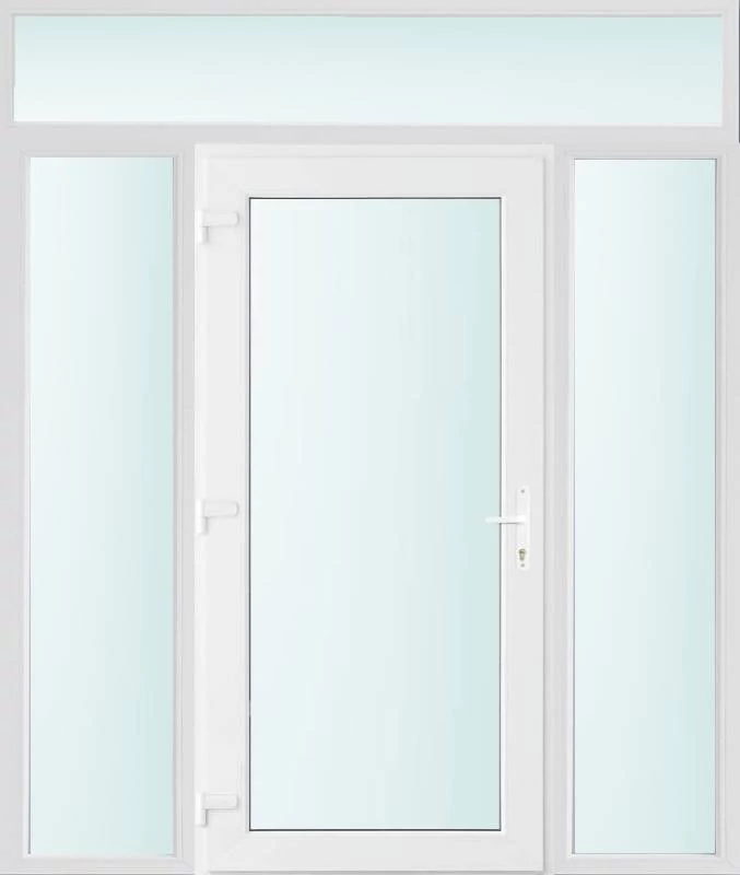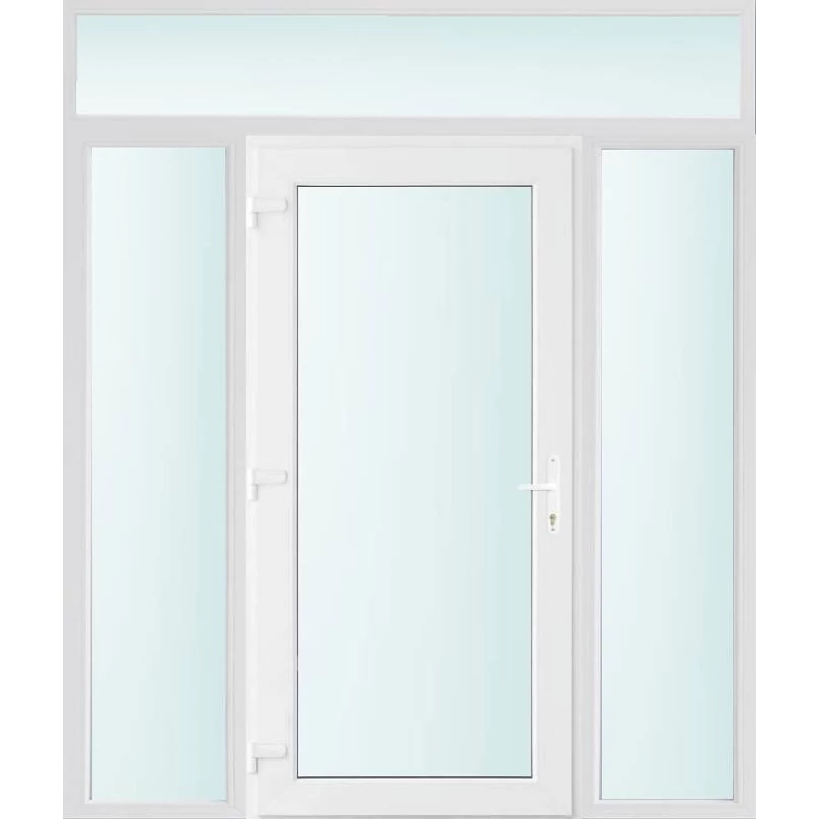 Kiváló hőszigetelésű műanyag bejárati ajtó 5 kamrás profilból, 70 mm beépítési mélységgel, tokban körbefutó idomacél merevítéssel. Vasalat: kilincsműködtetésű, VORNE 5 pontos ajtózárral, 3 db 3D erősített ajtópánttal, 20mm magas hőhídmentes alumínium küszöbbel. Dupla szürke ütközőtömítéssel rendelkezik. Üvegezése "VÍZTISZTA" 2 rétegű Szuper lágy bevonatos thermo üveg, 24 mm vastagságban, UG értéke: 1.0 W/m2K . A bejárati ajtó mindkét oldalán fehér színű. Nyitásmódja befelé nyíló, nyitásiránya balos ( bentről nézve a zsanér a bal oldalon helyezkedik el ). Tényleges tokkülmérete: 198 cm széles 238 cm magas. 98 cm széles 208 cm magas bejárati ajtóból, és 2 darab 50 cm széles 208 cm magas fix "SAVMART vagy VÍZTISZTA" üvegezésű ( nem nyitható) oldalvilágítóból és egy 198 cm széles 30 cm magas fix "SAVMART vagy VÍZTISZTA" üvegezésű ( nem nyitható) felülvilágítóból áll. ( négy külön elem ami beépítéskor összeszerelendő). A nyílászáró ára nem tartalmazza a KILINCSET és a ZÁRBETÉTET a beszereléshez szükséges segédanyagokat (falkampó, csavar, pur-hab..stb.), külső-belső takaróléceket.