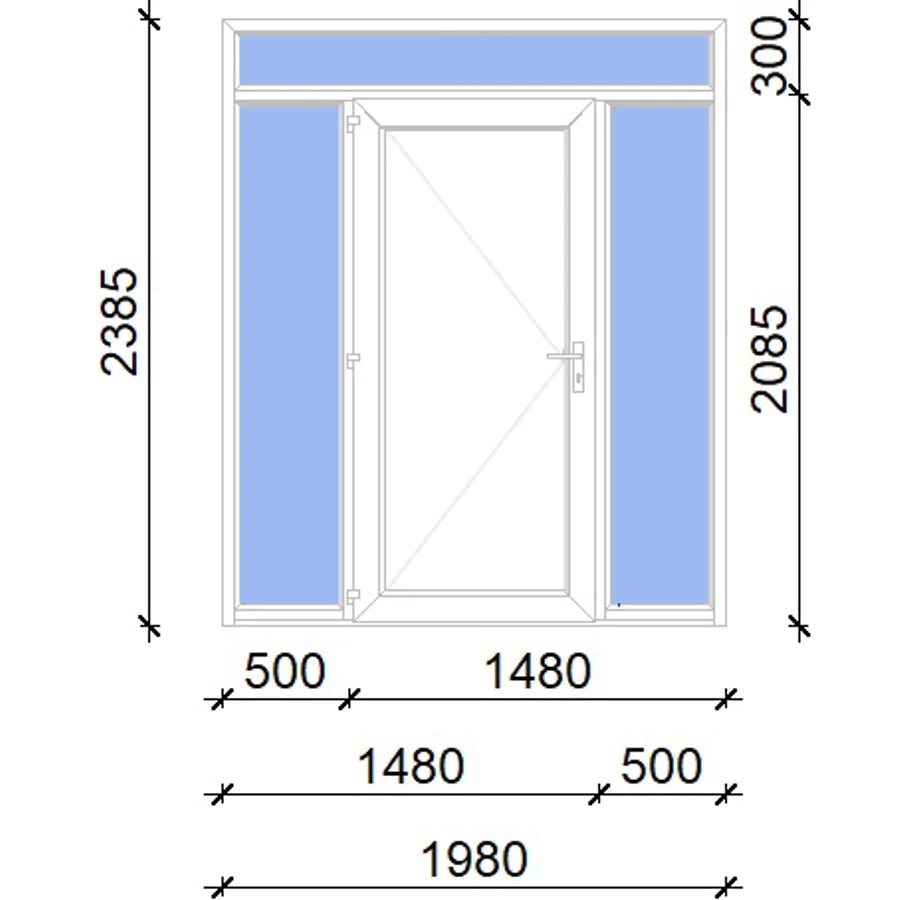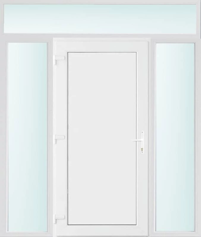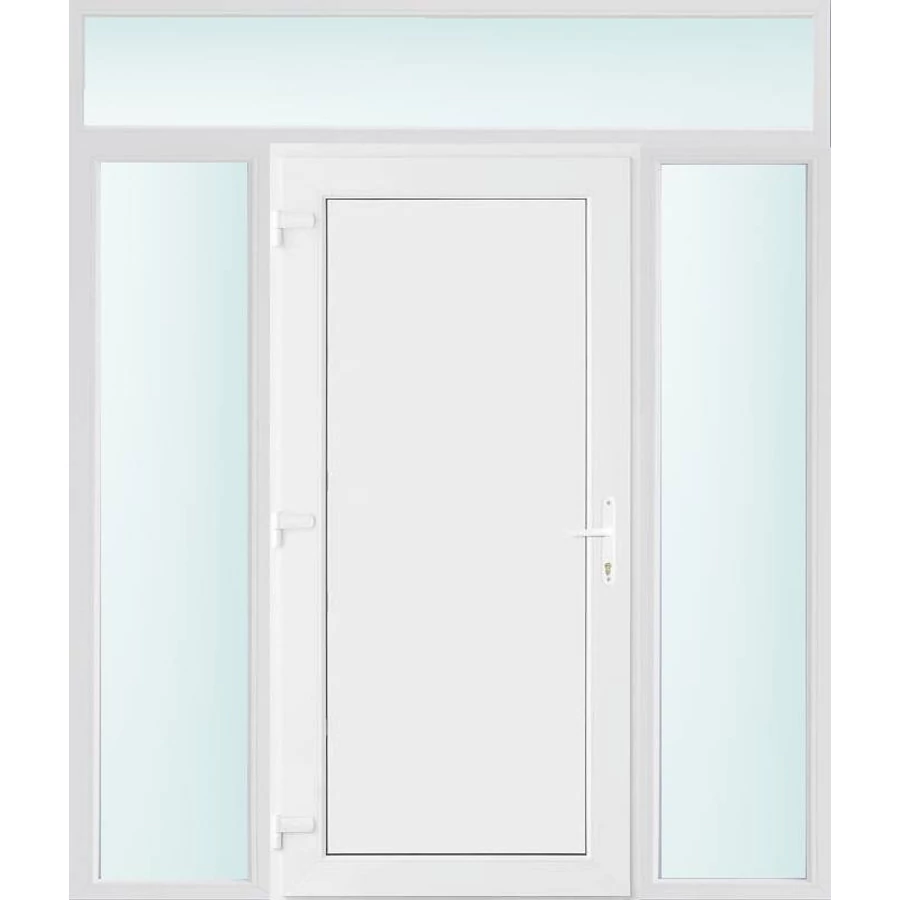 Kiváló hőszigetelésű műanyag bejárati ajtó 5 kamrás profilból, 70 mm beépítési mélységgel, tokban körbefutó idomacél merevítéssel. Vasalat: kilincsműködtetésű, VORNE 5 pontos ajtózárral, 3 db 3D erősített ajtópánttal, 20mm magas hőhídmentes alumínium küszöbbel. Dupla szürke ütközőtömítéssel rendelkezik. Üvegezése "SAVMART" katedrál 2 rétegű Szuperlágybevonatos thermo üveg, 24 mm vastagságban, UG értéke: 1.0 W/m2K . A bejárati ajtó mindkét oldalán fehér színű. Nyitásmódja befelé nyíló, nyitásiránya balos ( bentről nézve a zsanér a bal oldalon helyezkedik el ). Tényleges tokkülmérete: 198 cm széles 238 cm magas. 98 cm széles 208 cm magas bejárati ajtóból, és 2 darab 50 cm széles 208 cm magas fix "SAVMART" üvegezésű ( nem nyitható) oldalvilágítóból és egy 198 cm széles 30 cm magas fix "SAVMART" üvegezésű ( nem nyitható) felülvilágítóból áll. ( négy külön elem ami beépítéskor összeszerelendő). A nyílászáró ára nem tartalmazza a KILINCSET és a ZÁRBETÉTET a beszereléshez szükséges segédanyagokat (falkampó, csavar, pur-hab..stb.), külső-belső takaróléceket.