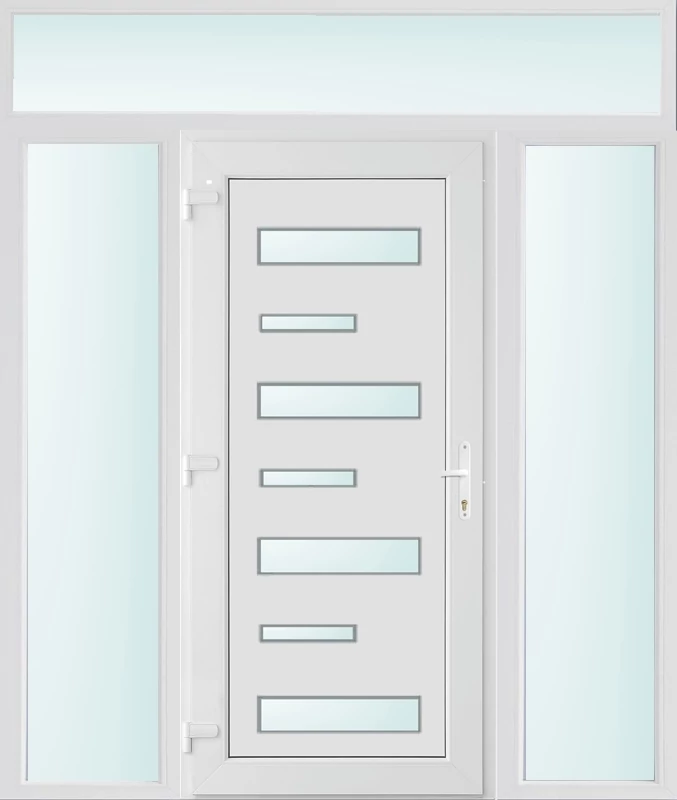 Kiváló hőszigetelésű műanyag bejárati ajtó 5 kamrás profilból, 70 mm beépítési mélységgel, tokban körbefutó idomacél merevítéssel. Vasalat: kilincsműködtetésű, VORNE 5 pontos ajtózárral, 3 db 3D erősített ajtópánttal, 20mm magas hőhídmentes alumínium küszöbbel. Dupla szürke ütközőtömítéssel rendelkezik. Üvegezése "SAVMART" katedrál 2 rétegű Szuperlágybevonatos thermo üveg, 24 mm vastagságban, UG értéke: 1.0 W/m2K . A bejárati ajtó mindkét oldalán fehér színű. Nyitásmódja befelé nyíló, nyitásiránya balos ( bentről nézve a zsanér a bal oldalon helyezkedik el ). Tényleges tokkülmérete: 198 cm széles 238 cm magas. 98 cm széles 208 cm magas bejárati ajtóból, és 2 darab 50 cm széles 208 cm magas fix "SAVMART" üvegezésű ( nem nyitható) oldalvilágítóból és egy 198 cm széles 30 cm magas fix "SAVMART" üvegezésű ( nem nyitható) felülvilágítóból áll. ( négy külön elem ami beépítéskor összeszerelendő). A nyílászáró ára nem tartalmazza a KILINCSET és a ZÁRBETÉTET a beszereléshez szükséges segédanyagokat (falkampó, csavar, pur-hab..stb.), külső-belső takaróléceket.