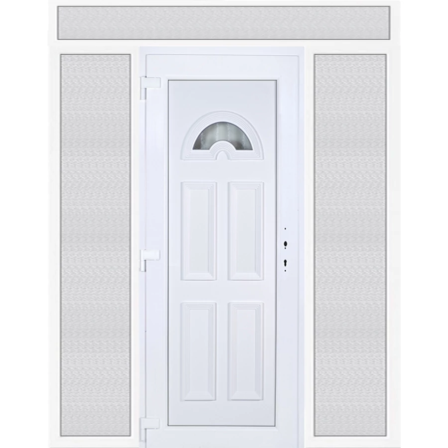 EXTRA hőszigetelésű műanyag bejárati ajtó 5 kamrás profilból, 70 mm beépítési mélységgel, tokban körbefutó idomacél merevítéssel. Vasalat: kilincsműködtetésű, 5 pontos ajtózárral, 3 db 3D erősített ajtópánttal, 20mm magas hőhídmentes alumínium küszöbbel, + 20mm purenittel a küszöb alatt. Dupla szürke ütközőtömítéssel rendelkezik. Üvegezése "savmart" katedrál 3 RÉTEGŰ Szuperlágybevonatos thermo üveg, 42 mm vastagságban, UG értéke: 0,7 W/m2K . A bejárati ajtó mindkét oldalán fehér színű. Nyitásmódja befelé nyíló, nyitásiránya balos ( bentről nézve a zsanér a bal oldalon helyezkedik el ). Tényleges tokkülmérete: 198 cm széles 239 cm magas. 98 cm széles 209 cm magas bejárati ajtóból, és 2 darab 50 cm széles 209 cm magas fix "savmart" üvegezésű ( nem nyitható) oldalvilágítóból és egy 198 cm széles 30 cm magas fix "savmart" üvegezésű ( nem nyitható) felülvilágítóból áll. ( négy külön elem ami beépítéskor összeszerelendő). A nyílászáró ára nem tartalmazza a KILINCSET és a ZÁRBETÉTET a beszereléshez szükséges segédanyagokat (falkampó, csavar, pur-hab..stb.), külső-belső takaróléceket.