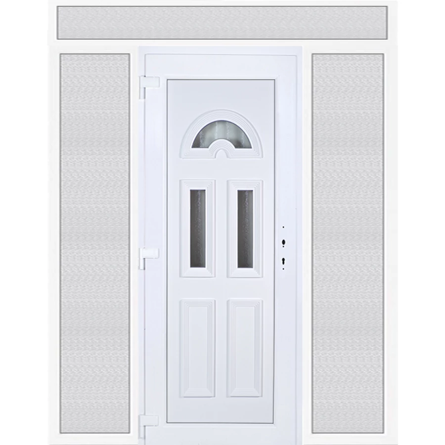 Kiváló hőszigetelésű műanyag bejárati ajtó 5 kamrás profilból, 70 mm beépítési mélységgel, tokban körbefutó idomacél merevítéssel. Vasalat: kilincsműködtetésű, 5 pontos ajtózárral, 3 db 3D erősített ajtópánttal, 35mm magas hőhídmentes alumínium küszöbbel. Dupla szürke ütközőtömítéssel rendelkezik. Üvegezése "GRÍZ" katedrál 2 rétegű Szuperlágybevonatos thermo üveg, 24 mm vastagságban, UG értéke: 1.0 W/m2K . A bejárati ajtó mindkét oldalán fehér színű. Nyitásmódja befelé nyíló, nyitásiránya balos ( bentről nézve a zsanér a bal oldalon helyezkedik el ). Tényleges tokkülmérete: 198 cm széles 238,5 cm magas. 98 cm széles 208,5 cm magas bejárati ajtóból, és 2 darab 50 cm széles 208,5 cm magas fix "GRÍZ" üvegezésű ( nem nyitható) oldalvilágítóból és egy 198 cm széles 30 cm magas fix "GRÍZ" üvegezésű ( nem nyitható) felülvilágítóból áll. ( négy külön elem ami beépítéskor összeszerelendő). A nyílászáró ára nem tartalmazza a KILINCSET és a ZÁRBETÉTET a beszereléshez szükséges segédanyagokat (falkampó, csavar, pur-hab..stb.), külső-belső takaróléceket.