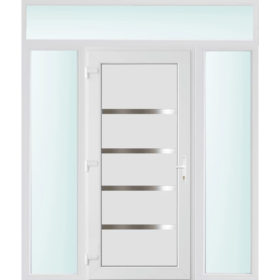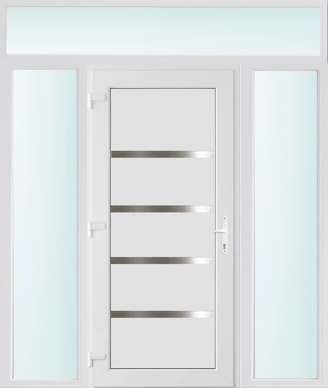 Kiváló hőszigetelésű műanyag bejárati ajtó 5 kamrás Pro line profilból, 70 mm beépítési mélységgel, tokban körbefutó idomacél merevítéssel. Vasalat: kilincsműködtetésű, VORNE 5 pontos ajtózárral, 3 db 3D erősített ajtópánttal, 20mm magas hőhídmentes alumínium küszöbbel. Dupla szürke ütközőtömítéssel rendelkezik. Üvegezése "SAVMART" katedrál 3 rétegű Szuperlágybevonatos thermo üveg, 40 mm vastagságban, UG értéke: 0.7 W/m2K . A bejárati ajtó mindkét oldalán fehér színű. Nyitásmódja befelé nyíló, nyitásiránya balos ( bentről nézve a zsanér a bal oldalon helyezkedik el ). Tényleges tokkülmérete: 198 cm széles 238 cm magas A nyílászáró ára nem tartalmazza a KILINCSET és a ZÁRBETÉTET a beszereléshez szükséges segédanyagokat (falkampó, csavar, pur-hab..stb.), külső-belső takaróléceket.