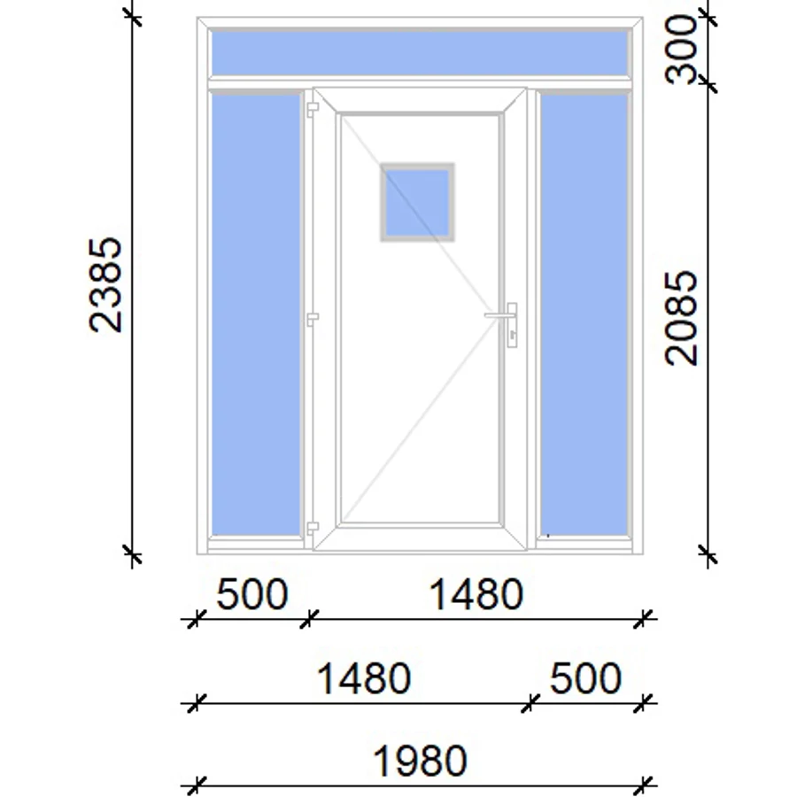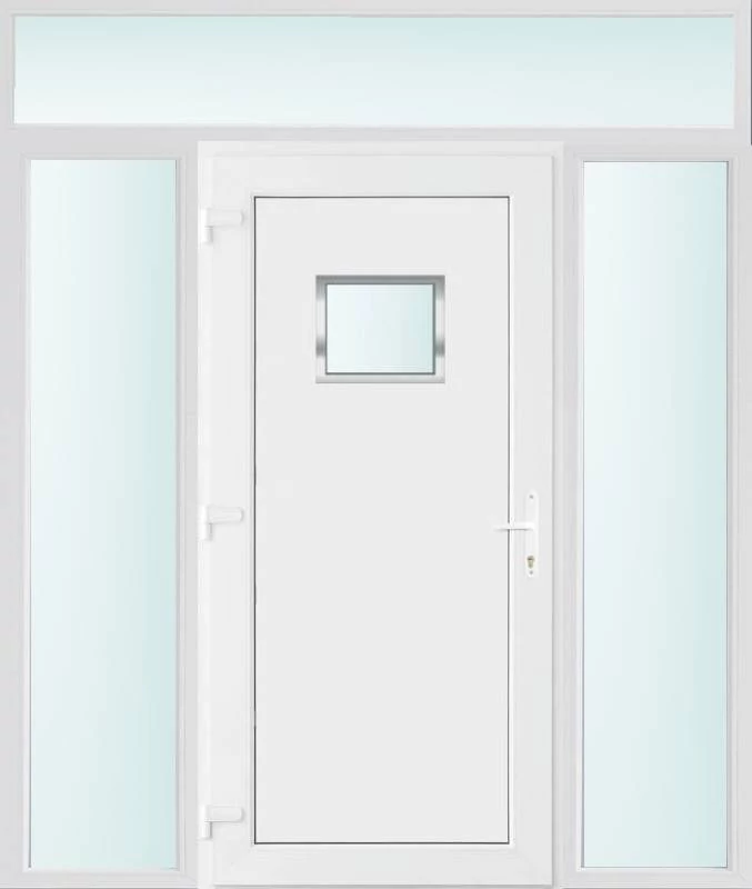 Kiváló hőszigetelésű műanyag bejárati ajtó 5 kamrás profilból, 70 mm beépítési mélységgel, tokban körbefutó idomacél merevítéssel. Vasalat: kilincsműködtetésű, VORNE 5 pontos ajtózárral, 3 db 3D erősített ajtópánttal, 20mm magas hőhídmentes alumínium küszöbbel. Dupla szürke ütközőtömítéssel rendelkezik. Üvegezése "SAVMART" katedrál 2 rétegű Szuperlágybevonatos thermo üveg, 24 mm vastagságban, UG értéke: 1.0 W/m2K . A bejárati ajtó mindkét oldalán fehér színű. Nyitásmódja befelé nyíló, nyitásiránya balos ( bentről nézve a zsanér a bal oldalon helyezkedik el ). Tényleges tokkülmérete: 198 cm széles 238 cm magas. 98 cm széles 208 cm magas bejárati ajtóból, és 2 darab 50 cm széles 208 cm magas fix "SAVMART" üvegezésű ( nem nyitható) oldalvilágítóból és egy 198 cm széles 30 cm magas fix "SAVMART" üvegezésű ( nem nyitható) felülvilágítóból áll. ( négy külön elem ami beépítéskor összeszerelendő). A nyílászáró ára nem tartalmazza a KILINCSET és a ZÁRBETÉTET a beszereléshez szükséges segédanyagokat (falkampó, csavar, pur-hab..stb.), külső-belső takaróléceket.