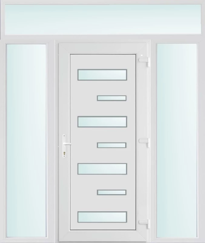 EXTRA hőszigetelésű műanyag bejárati ajtó 5 kamrás profilból, 70 mm beépítési mélységgel, tokban körbefutó idomacél merevítéssel. Vasalat: kilincsműködtetésű, 5 pontos ajtózárral, 3 db 3D erősített ajtópánttal, 20mm magas hőhídmentes alumínium küszöbbel, + 20mm purenittel a küszöb alatt. Dupla szürke ütközőtömítéssel rendelkezik. Üvegezése "savmart" katedrál 3 RÉTEGŰ Szuperlágybevonatos thermo üveg, 42 mm vastagságban, UG értéke: 0,7 W/m2K . A bejárati ajtó mindkét oldalán fehér színű. Nyitásmódja befelé nyíló, nyitásiránya jobbos ( bentről nézve a zsanér a jobb oldalon helyezkedik el ). Tényleges tokkülmérete: 198 cm széles 239 cm magas. 98 cm széles 209 cm magas bejárati ajtóból, és 2 darab 50 cm széles 209 cm magas fix "savmart" üvegezésű ( nem nyitható) oldalvilágítóból és egy 198 cm széles 30 cm magas fix "savmart" üvegezésű ( nem nyitható) felülvilágítóból áll. ( négy külön elem ami beépítéskor összeszerelendő). A nyílászáró ára nem tartalmazza a KILINCSET és a ZÁRBETÉTET a beszereléshez szükséges segédanyagokat (falkampó, csavar, pur-hab..stb.), külső-belső takaróléceket.