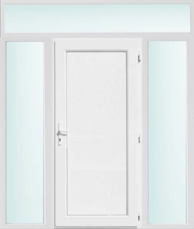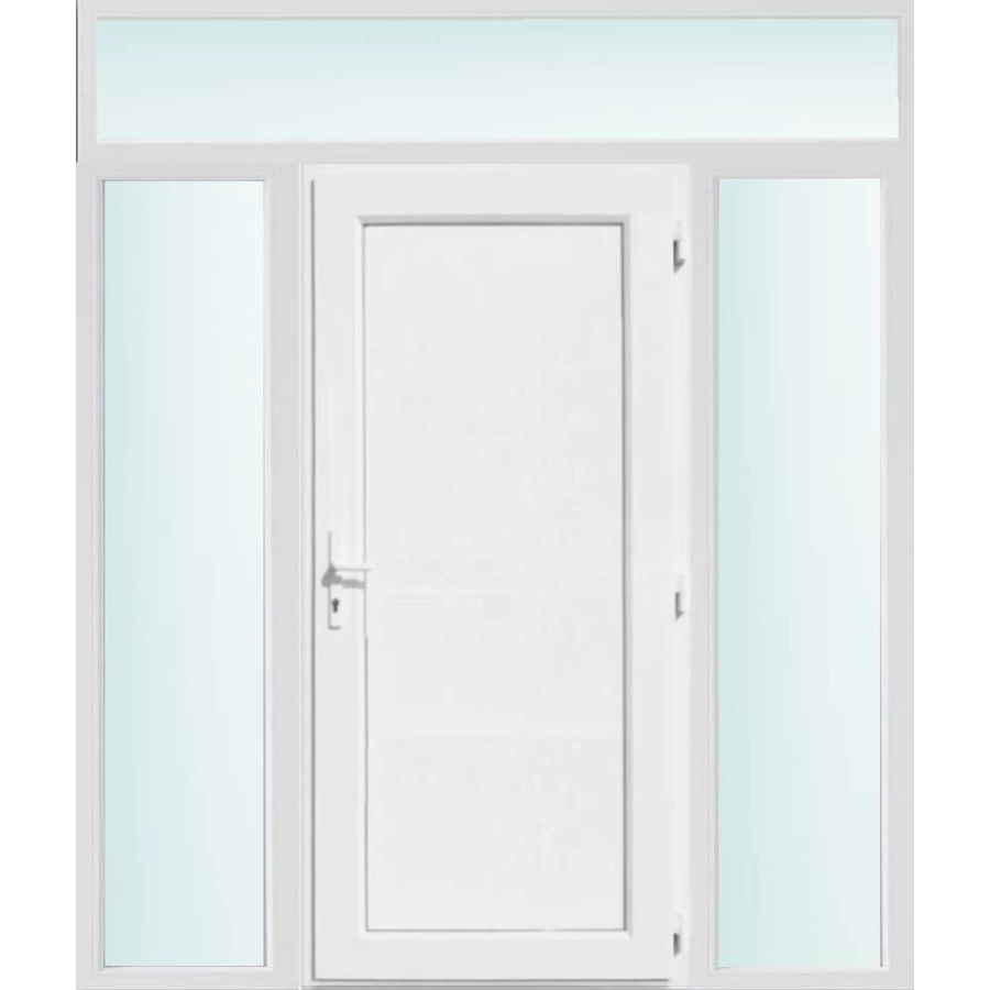 Kiváló hőszigetelésű műanyag bejárati ajtó 5 kamrás profilból, 70 mm beépítési mélységgel, tokban körbefutó idomacél merevítéssel. Vasalat: kilincsműködtetésű, VORNE 5 pontos ajtózárral, 3 db 3D erősített ajtópánttal, 20mm magas hőhídmentes alumínium küszöbbel. Dupla szürke ütközőtömítéssel rendelkezik. Üvegezése "SAVMART" katedrál 2 rétegű Szuperlágybevonatos thermo üveg, 24 mm vastagságban, UG értéke: 1.0 W/m2K . A bejárati ajtó mindkét oldalán fehér színű. Nyitásmódja befelé nyíló, nyitásiránya jobbos ( bentről nézve a zsanér a jobb oldalon helyezkedik el ). Tényleges tokkülmérete: 198 cm széles 238 cm magas. 98 cm széles 208 cm magas bejárati ajtóból, és 2 darab 50 cm széles 208 cm magas fix "SAVMART" üvegezésű ( nem nyitható) oldalvilágítóból és egy 198 cm széles 30 cm magas fix "SAVMART" üvegezésű ( nem nyitható) felülvilágítóból áll. ( négy külön elem ami beépítéskor összeszerelendő). A nyílászáró ára nem tartalmazza a KILINCSET és a ZÁRBETÉTET a beszereléshez szükséges segédanyagokat (falkampó, csavar, pur-hab..stb.), külső-belső takaróléceket.