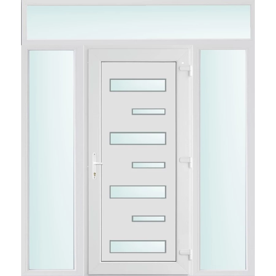 Kiváló hőszigetelésű műanyag bejárati ajtó 5 kamrás profilból, 70 mm beépítési mélységgel, tokban körbefutó idomacél merevítéssel. Vasalat: kilincsműködtetésű, VORNE 5 pontos ajtózárral, 3 db 3D erősített ajtópánttal, 20mm magas hőhídmentes alumínium küszöbbel. Dupla szürke ütközőtömítéssel rendelkezik. Üvegezése "SAVMART" katedrál 2 rétegű Szuperlágybevonatos thermo üveg, 24 mm vastagságban, UG értéke: 1.0 W/m2K . A bejárati ajtó mindkét oldalán fehér színű. Nyitásmódja befelé nyíló, nyitásiránya jobbos ( bentről nézve a zsanér a jobb oldalon helyezkedik el ). Tényleges tokkülmérete: 198 cm széles 238 cm magas. 98 cm széles 208 cm magas bejárati ajtóból, és 2 darab 50 cm széles 208 cm magas fix "SAVMART" üvegezésű ( nem nyitható) oldalvilágítóból és egy 198 cm széles 30 cm magas fix "SAVMART" üvegezésű ( nem nyitható) felülvilágítóból áll. ( négy külön elem ami beépítéskor összeszerelendő). A nyílászáró ára nem tartalmazza a KILINCSET és a ZÁRBETÉTET a beszereléshez szükséges segédanyagokat (falkampó, csavar, pur-hab..stb.), külső-belső takaróléceket.