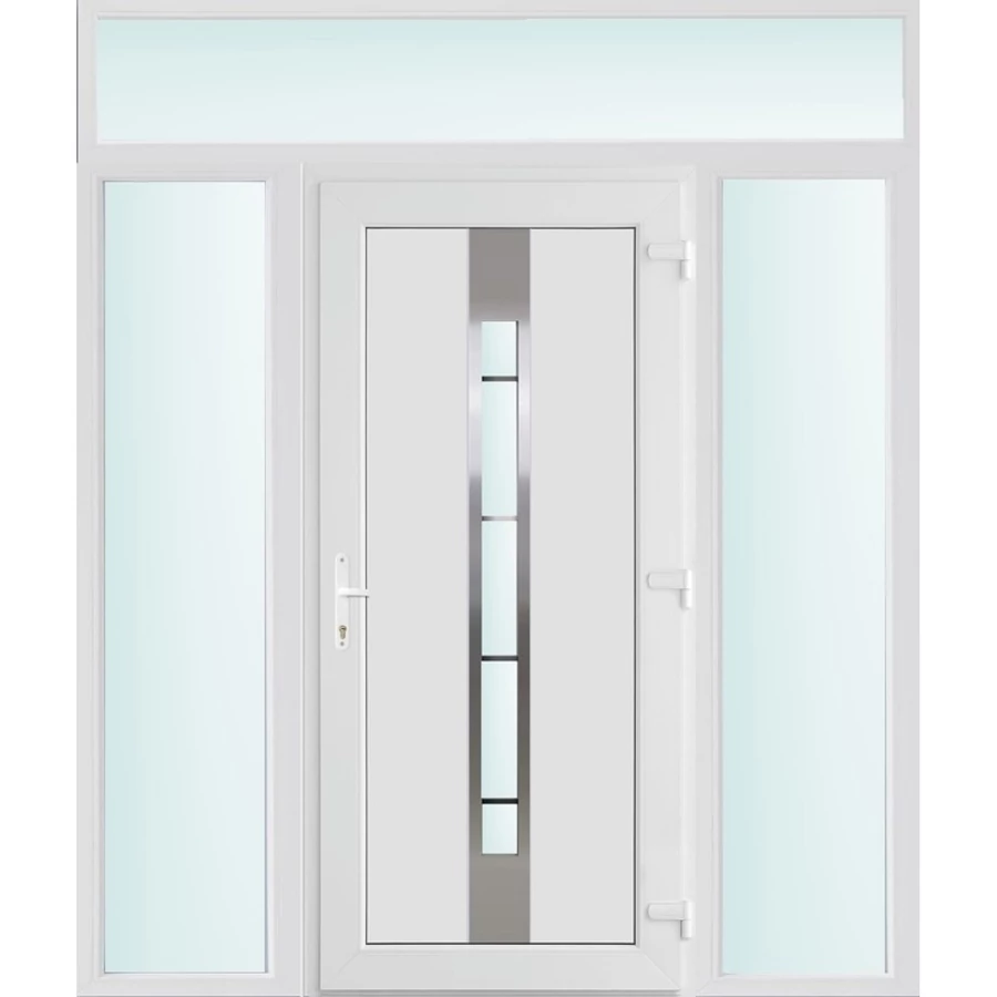 Kiváló hőszigetelésű műanyag bejárati ajtó 5 kamrás Pro line profilból, 70 mm beépítési mélységgel, tokban körbefutó idomacél merevítéssel. Vasalat: kilincsműködtetésű, VORNE 5 pontos ajtózárral, 3 db 3D erősített ajtópánttal, 20mm magas hőhídmentes alumínium küszöbbel. Dupla szürke ütközőtömítéssel rendelkezik. Üvegezése "SAVMART" katedrál 3 rétegű Szuperlágybevonatos thermo üveg, 40 mm vastagságban, UG értéke: 0.7 W/m2K . A bejárati ajtó mindkét oldalán fehér színű. Nyitásmódja befelé nyíló, nyitásiránya jobbos ( bentről nézve a zsanér a bal oldalon helyezkedik el ). Tényleges tokkülmérete: 198 cm széles 238 cm magas A nyílászáró ára nem tartalmazza a KILINCSET és a ZÁRBETÉTET a beszereléshez szükséges segédanyagokat (falkampó, csavar, pur-hab..stb.), külső-belső takaróléceket.