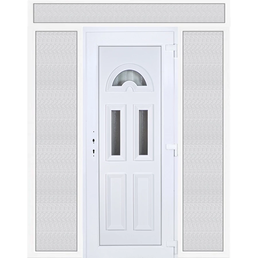 EXTRA hőszigetelésű műanyag bejárati ajtó 5 kamrás profilból, 70 mm beépítési mélységgel, tokban körbefutó idomacél merevítéssel. Vasalat: kilincsműködtetésű, 5 pontos ajtózárral, 3 db 3D erősített ajtópánttal, 20mm magas hőhídmentes alumínium küszöbbel, + 20mm purenittel a küszöb alatt. Dupla szürke ütközőtömítéssel rendelkezik. Üvegezése "savmart" katedrál 3 RÉTEGŰ Szuperlágybevonatos thermo üveg, 42 mm vastagságban, UG értéke: 0,7 W/m2K . A bejárati ajtó mindkét oldalán fehér színű. Nyitásmódja befelé nyíló, nyitásiránya jobbos ( bentről nézve a zsanér a jobb oldalon helyezkedik el ). Tényleges tokkülmérete: 198 cm széles 239 cm magas. 98 cm széles 209 cm magas bejárati ajtóból, és 2 darab 50 cm széles 209 cm magas fix "savmart" üvegezésű ( nem nyitható) oldalvilágítóból és egy 198 cm széles 30 cm magas fix "savmart" üvegezésű ( nem nyitható) felülvilágítóból áll. ( négy külön elem ami beépítéskor összeszerelendő). A nyílászáró ára nem tartalmazza a KILINCSET és a ZÁRBETÉTET a beszereléshez szükséges segédanyagokat (falkampó, csavar, pur-hab..stb.), külső-belső takaróléceket.
