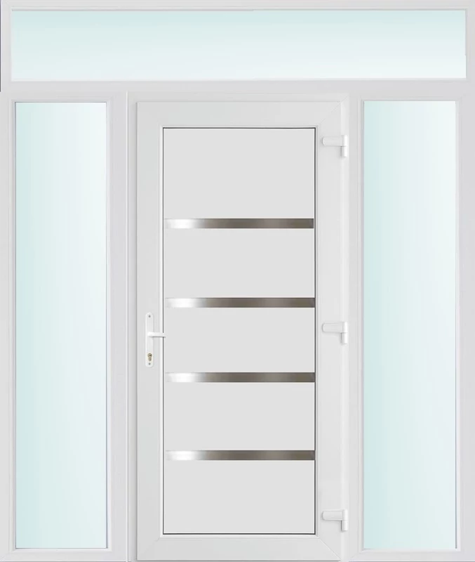 Kiváló hőszigetelésű műanyag bejárati ajtó 5 kamrás profilból, 70 mm beépítési mélységgel, tokban körbefutó idomacél merevítéssel. Vasalat: kilincsműködtetésű, VORNE 5 pontos ajtózárral, 3 db 3D erősített ajtópánttal, 20mm magas hőhídmentes alumínium küszöbbel. Dupla szürke ütközőtömítéssel rendelkezik. Üvegezése "SAVMART" katedrál 2 rétegű Szuperlágybevonatos thermo üveg, 24 mm vastagságban, UG értéke: 1.0 W/m2K . A bejárati ajtó mindkét oldalán fehér színű. Nyitásmódja befelé nyíló, nyitásiránya jobbos ( bentről nézve a zsanér a jobb oldalon helyezkedik el ). Tényleges tokkülmérete: 198 cm széles 238 cm magas. 98 cm széles 208 cm magas bejárati ajtóból, és 2 darab 50 cm széles 208 cm magas fix "SAVMART" üvegezésű ( nem nyitható) oldalvilágítóból és egy 198 cm széles 30 cm magas fix "SAVMART" üvegezésű ( nem nyitható) felülvilágítóból áll. ( négy külön elem ami beépítéskor összeszerelendő). A nyílászáró ára nem tartalmazza a KILINCSET és a ZÁRBETÉTET a beszereléshez szükséges segédanyagokat (falkampó, csavar, pur-hab..stb.), külső-belső takaróléceket.