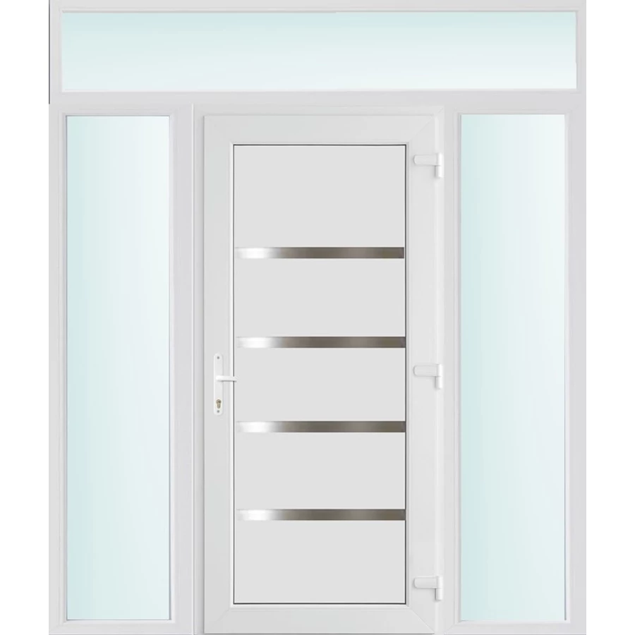 Kiváló hőszigetelésű műanyag bejárati ajtó 5 kamrás Pro line profilból, 70 mm beépítési mélységgel, tokban körbefutó idomacél merevítéssel. Vasalat: kilincsműködtetésű, VORNE 5 pontos ajtózárral, 3 db 3D erősített ajtópánttal, 20mm magas hőhídmentes alumínium küszöbbel. Dupla szürke ütközőtömítéssel rendelkezik. Üvegezése "SAVMART" katedrál 3 rétegű Szuperlágybevonatos thermo üveg, 40 mm vastagságban, UG értéke: 0.7 W/m2K . A bejárati ajtó mindkét oldalán fehér színű. Nyitásmódja befelé nyíló, nyitásiránya jobbos ( bentről nézve a zsanér a bal oldalon helyezkedik el ). Tényleges tokkülmérete: 198 cm széles 238 cm magas A nyílászáró ára nem tartalmazza a KILINCSET és a ZÁRBETÉTET a beszereléshez szükséges segédanyagokat (falkampó, csavar, pur-hab..stb.), külső-belső takaróléceket.
