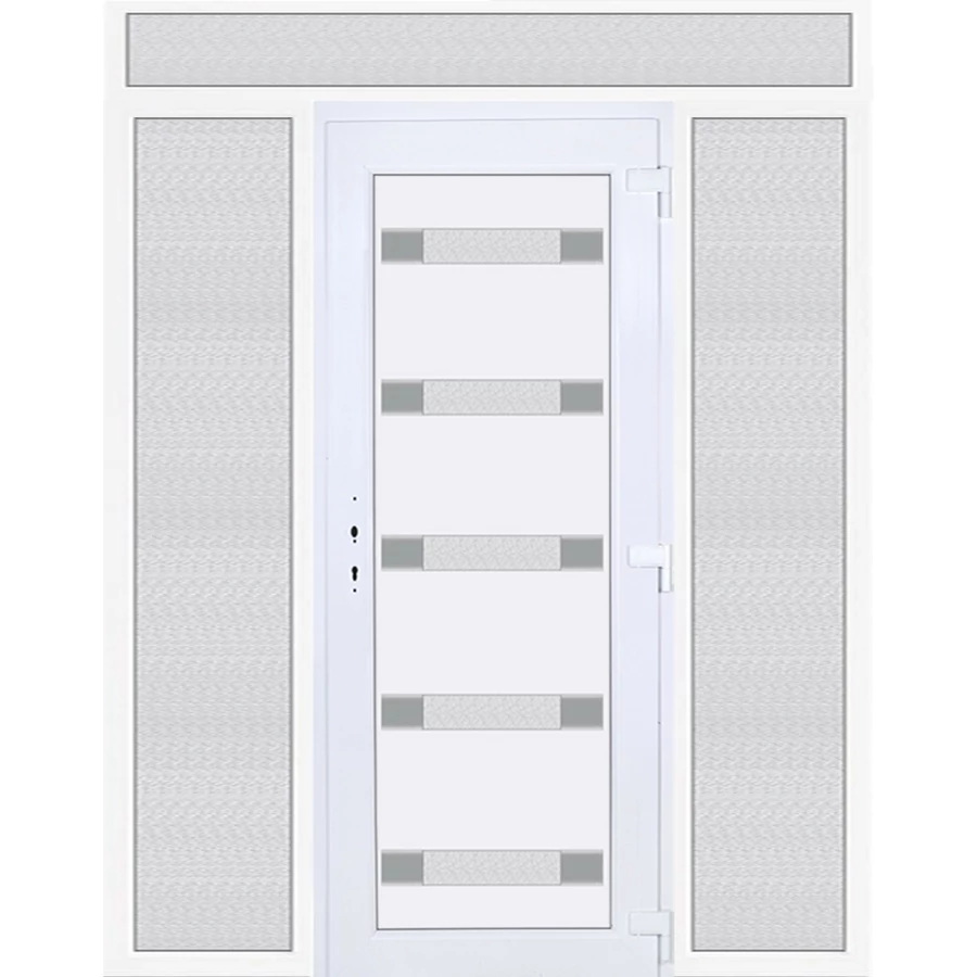 EXTRA hőszigetelésű műanyag bejárati ajtó 5 kamrás profilból, 70 mm beépítési mélységgel, tokban körbefutó idomacél merevítéssel. Vasalat: kilincsműködtetésű, 5 pontos ajtózárral, 3 db 3D erősített ajtópánttal, 20mm magas hőhídmentes alumínium küszöbbel, + 20mm purenittel a küszöb alatt. Dupla szürke ütközőtömítéssel rendelkezik. Üvegezése "savmart" katedrál 3 RÉTEGŰ Szuperlágybevonatos thermo üveg, 42 mm vastagságban, UG értéke: 0,7 W/m2K . A bejárati ajtó mindkét oldalán fehér színű. Nyitásmódja befelé nyíló, nyitásiránya jobbos ( bentről nézve a zsanér a jobb oldalon helyezkedik el ). Tényleges tokkülmérete: 198 cm széles 239 cm magas. 98 cm széles 209 cm magas bejárati ajtóból, és 2 darab 50 cm széles 209 cm magas fix "savmart" üvegezésű ( nem nyitható) oldalvilágítóból és egy 198 cm széles 30 cm magas fix "savmart" üvegezésű ( nem nyitható) felülvilágítóból áll. ( négy külön elem ami beépítéskor összeszerelendő). A nyílászáró ára nem tartalmazza a KILINCSET és a ZÁRBETÉTET a beszereléshez szükséges segédanyagokat (falkampó, csavar, pur-hab..stb.), külső-belső takaróléceket.