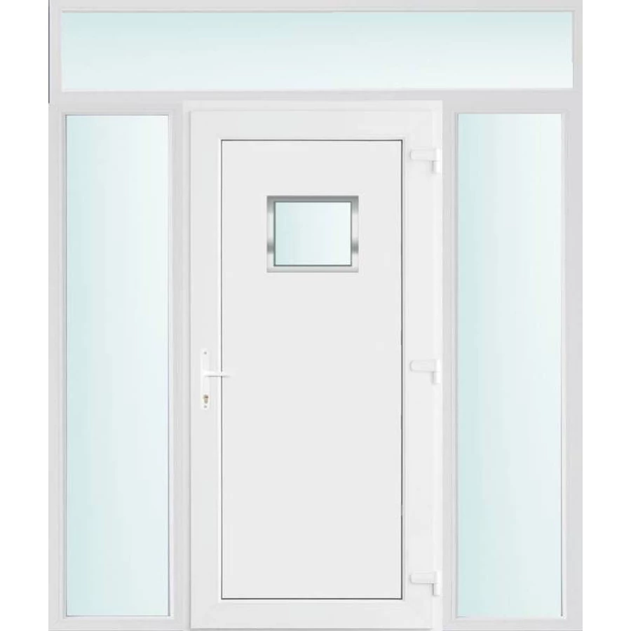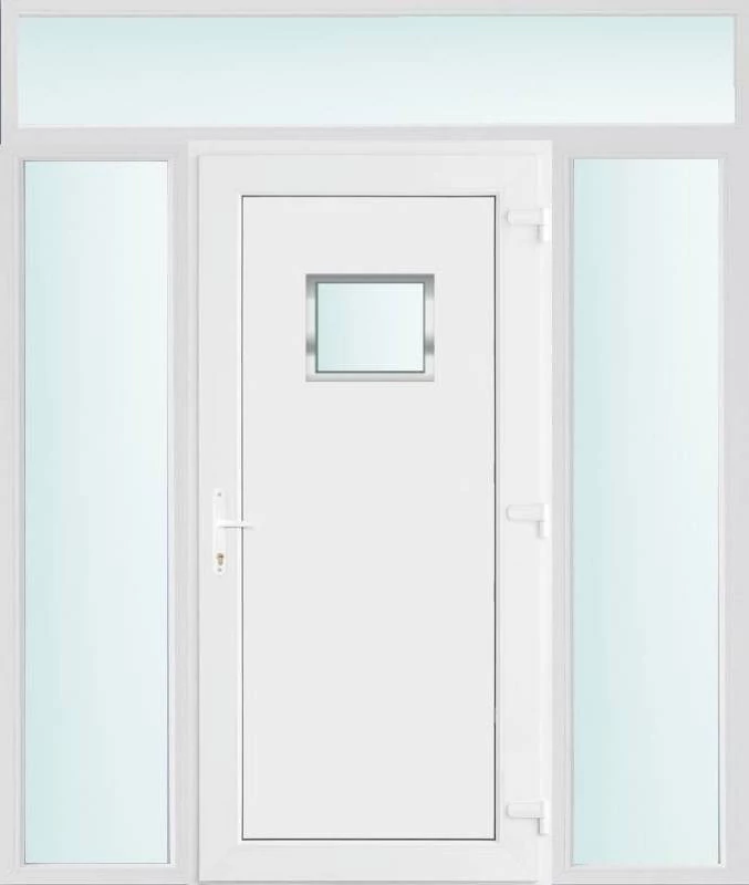 Kiváló hőszigetelésű műanyag bejárati ajtó 5 kamrás profilból, 70 mm beépítési mélységgel, tokban körbefutó idomacél merevítéssel. Vasalat: kilincsműködtetésű, VORNE 5 pontos ajtózárral, 3 db 3D erősített ajtópánttal, 20mm magas hőhídmentes alumínium küszöbbel. Dupla szürke ütközőtömítéssel rendelkezik. Üvegezése "SAVMART" katedrál 2 rétegű Szuperlágybevonatos thermo üveg, 24 mm vastagságban, UG értéke: 1.0 W/m2K . A bejárati ajtó mindkét oldalán fehér színű. Nyitásmódja befelé nyíló, nyitásiránya jobbos ( bentről nézve a zsanér a jobb oldalon helyezkedik el ). Tényleges tokkülmérete: 198 cm széles 238 cm magas. 98 cm széles 208 cm magas bejárati ajtóból, és 2 darab 50 cm széles 208 cm magas fix "SAVMART" üvegezésű ( nem nyitható) oldalvilágítóból és egy 198 cm széles 30 cm magas fix "SAVMART" üvegezésű ( nem nyitható) felülvilágítóból áll. ( négy külön elem ami beépítéskor összeszerelendő). A nyílászáró ára nem tartalmazza a KILINCSET és a ZÁRBETÉTET a beszereléshez szükséges segédanyagokat (falkampó, csavar, pur-hab..stb.), külső-belső takaróléceket.