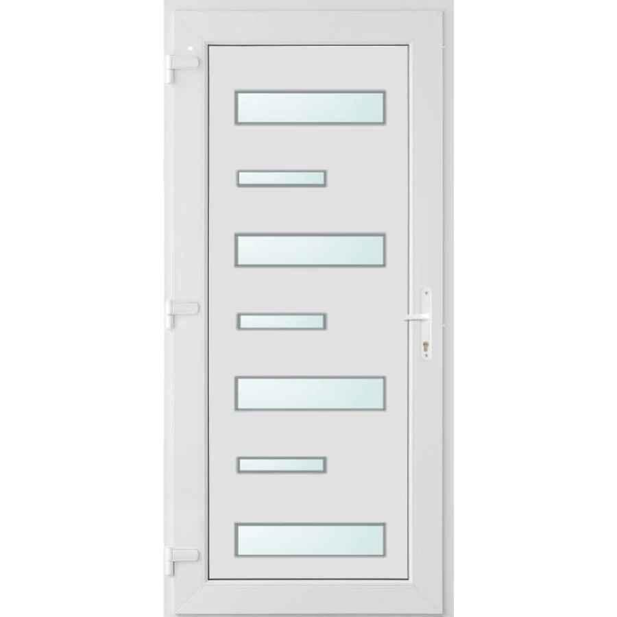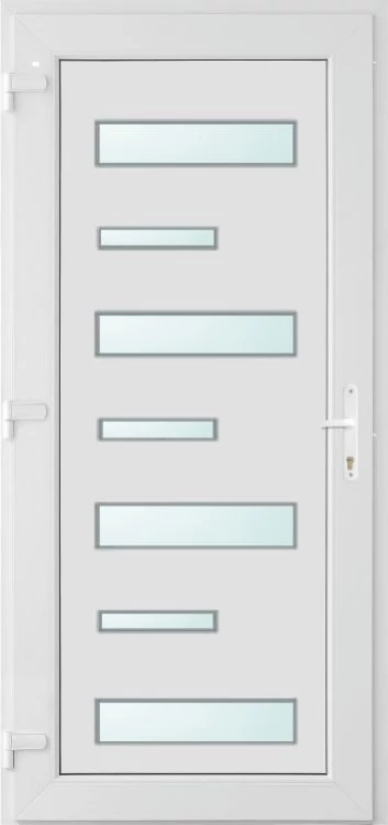 EXTRA hőszigetelésű műanyag bejárati ajtó 5 kamrás profilból, 70 mm beépítési mélységgel, tokban körbefutó idomacél merevítéssel. Vasalat: kilincsműködtetésű, 5 pontos ajtózárral, 3 db 3D erősített ajtópánttal, 20mm magas hőhídmentes alumínium küszöbbel, + 20mm purenittel a küszöb alatt. Dupla szürke ütközőtömítéssel rendelkezik. Üvegezése "savmart" katedrál 3 RÉTEGŰ Szuperlágybevonatos thermo üveg, 42 mm vastagságban, UG értéke: 0,7 W/m2K . A bejárati ajtó mindkét oldalán fehér színű. Nyitásmódja befelé nyíló, nyitásiránya balos ( bentről nézve a zsanér a bal oldalon helyezkedik el ). Tényleges tokkülmérete: 88 cm széles 209 cm magas A nyílászáró ára nem tartalmazza a KILINCSET és a ZÁRBETÉTET a beszereléshez szükséges segédanyagokat (falkampó, csavar, pur-hab..stb.), külső-belső takaróléceket.