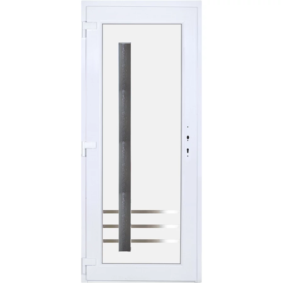 Kiváló hőszigetelésű műanyag bejárati ajtó 5 kamrás profilból, 70 mm beépítési mélységgel, tokban körbefutó idomacél merevítéssel. Vasalat: kilincsműködtetésű, 5 pontos ajtózárral, 3 db 3D erősített ajtópánttal, 35mm magas hőhídmentes alumínium küszöbbel. Dupla szürke ütközőtömítéssel rendelkezik. Üvegezése "GRÍZ" katedrál 2 rétegű Szuperlágybevonatos thermo üveg, 24 mm vastagságban, UG értéke: 1.0 W/m2K . A bejárati ajtó mindkét oldalán fehér színű. Nyitásmódja befelé nyíló, nyitásiránya balos ( bentről nézve a zsanér a bal oldalon helyezkedik el ). Tényleges tokkülmérete: 88 cm széles 208,5 cm magas A nyílászáró ára nem tartalmazza a KILINCSET és a ZÁRBETÉTET a beszereléshez szükséges segédanyagokat (falkampó, csavar, pur-hab..stb.), külső-belső takaróléceket.