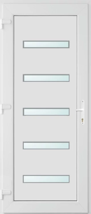 Kiváló hőszigetelésű műanyag bejárati ajtó 5 kamrás profilból, 70 mm beépítési mélységgel, tokban körbefutó idomacél merevítéssel. Vasalat: kilincsműködtetésű, VORNE 5 pontos ajtózárral, 3 db 3D erősített ajtópánttal, 20mm magas hőhídmentes alumínium küszöbbel. Dupla szürke ütközőtömítéssel rendelkezik. Üvegezése "SAVMART" katedrál 2 rétegű Szuperlágybevonatos thermo üveg, 24 mm vastagságban, UG értéke: 1.0 W/m2K . A bejárati ajtó mindkét oldalán fehér színű. Nyitásmódja befelé nyíló, nyitásiránya balos ( bentről nézve a zsanér a bal oldalon helyezkedik el ). Tényleges tokkülmérete: 88 cm széles 208 cm magas A nyílászáró ára nem tartalmazza a KILINCSET és a ZÁRBETÉTET a beszereléshez szükséges segédanyagokat (falkampó, csavar, pur-hab..stb.), külső-belső takaróléceket.