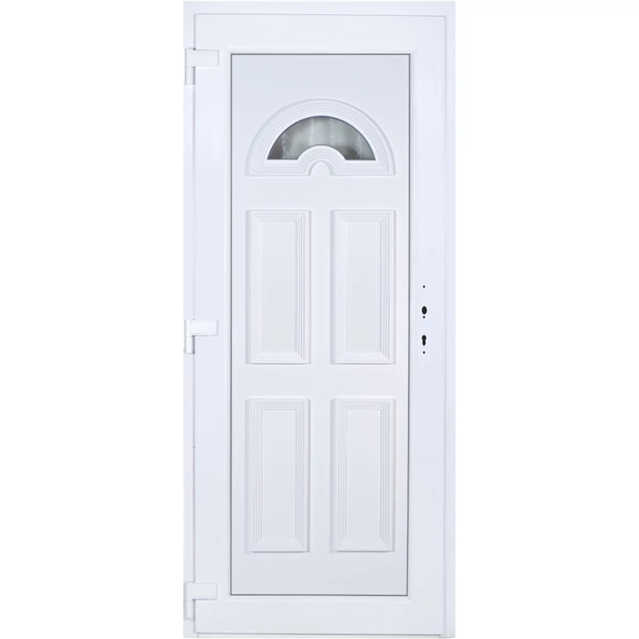 Kiváló hőszigetelésű műanyag bejárati ajtó 5 kamrás profilból, 70 mm beépítési mélységgel, tokban körbefutó idomacél merevítéssel. Vasalat: kilincsműködtetésű, 5 pontos ajtózárral, 3 db 3D erősített ajtópánttal, 35mm magas hőhídmentes alumínium küszöbbel. Dupla szürke ütközőtömítéssel rendelkezik. Üvegezése "GRÍZ" katedrál 2 rétegű Szuperlágybevonatos thermo üveg, 24 mm vastagságban, UG értéke: 1.0 W/m2K . A bejárati ajtó mindkét oldalán fehér színű. Nyitásmódja befelé nyíló, nyitásiránya balos ( bentről nézve a zsanér a bal oldalon helyezkedik el ). Tényleges tokkülmérete: 88 cm széles 208,5 cm magas A nyílászáró ára nem tartalmazza a KILINCSET és a ZÁRBETÉTET a beszereléshez szükséges segédanyagokat (falkampó, csavar, pur-hab..stb.), külső-belső takaróléceket.
