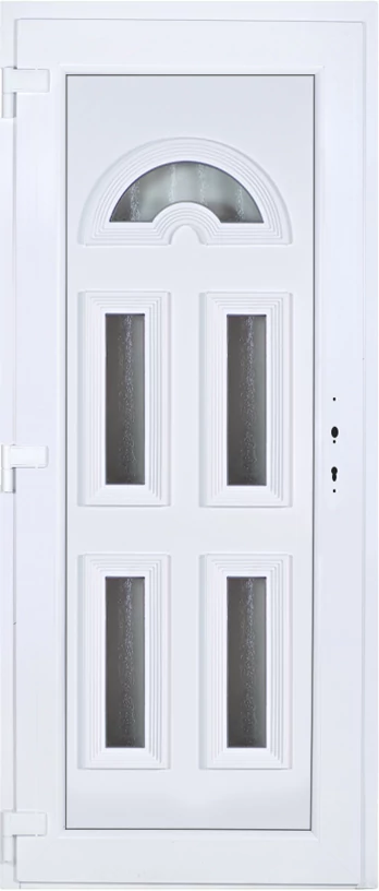EXTRA hőszigetelésű műanyag bejárati ajtó 5 kamrás profilból, 70 mm beépítési mélységgel, tokban körbefutó idomacél merevítéssel. Vasalat: kilincsműködtetésű, 5 pontos ajtózárral, 3 db 3D erősített ajtópánttal, 20mm magas hőhídmentes alumínium küszöbbel, + 20mm purenittel a küszöb alatt. Dupla szürke ütközőtömítéssel rendelkezik. Üvegezése "savmart" katedrál 3 RÉTEGŰ Szuperlágybevonatos thermo üveg, 42 mm vastagságban, UG értéke: 0,7 W/m2K . A bejárati ajtó mindkét oldalán fehér színű. Nyitásmódja befelé nyíló, nyitásiránya balos ( bentről nézve a zsanér a bal oldalon helyezkedik el ). Tényleges tokkülmérete: 88 cm széles 209 cm magas A nyílászáró ára nem tartalmazza a KILINCSET és a ZÁRBETÉTET a beszereléshez szükséges segédanyagokat (falkampó, csavar, pur-hab..stb.), külső-belső takaróléceket.