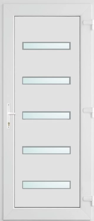 Kiváló hőszigetelésű műanyag bejárati ajtó 5 kamrás profilból, 70 mm beépítési mélységgel, tokban körbefutó idomacél merevítéssel. Vasalat: kilincsműködtetésű, VORNE 5 pontos ajtózárral, 3 db 3D erősített ajtópánttal, 20mm magas hőhídmentes alumínium küszöbbel. Dupla szürke ütközőtömítéssel rendelkezik. Üvegezése "SAVMART" katedrál 2 rétegű Szuperlágybevonatos thermo üveg, 24 mm vastagságban, UG értéke: 1.0 W/m2K . A bejárati ajtó mindkét oldalán fehér színű. Nyitásmódja befelé nyíló, nyitásiránya jobbos ( bentről nézve a zsanér a jobb oldalon helyezkedik el ). Tényleges tokkülmérete: 88 cm széles 208 cm magas A nyílászáró ára nem tartalmazza a KILINCSET és a ZÁRBETÉTET a beszereléshez szükséges segédanyagokat (falkampó, csavar, pur-hab..stb.), külső-belső takaróléceket.