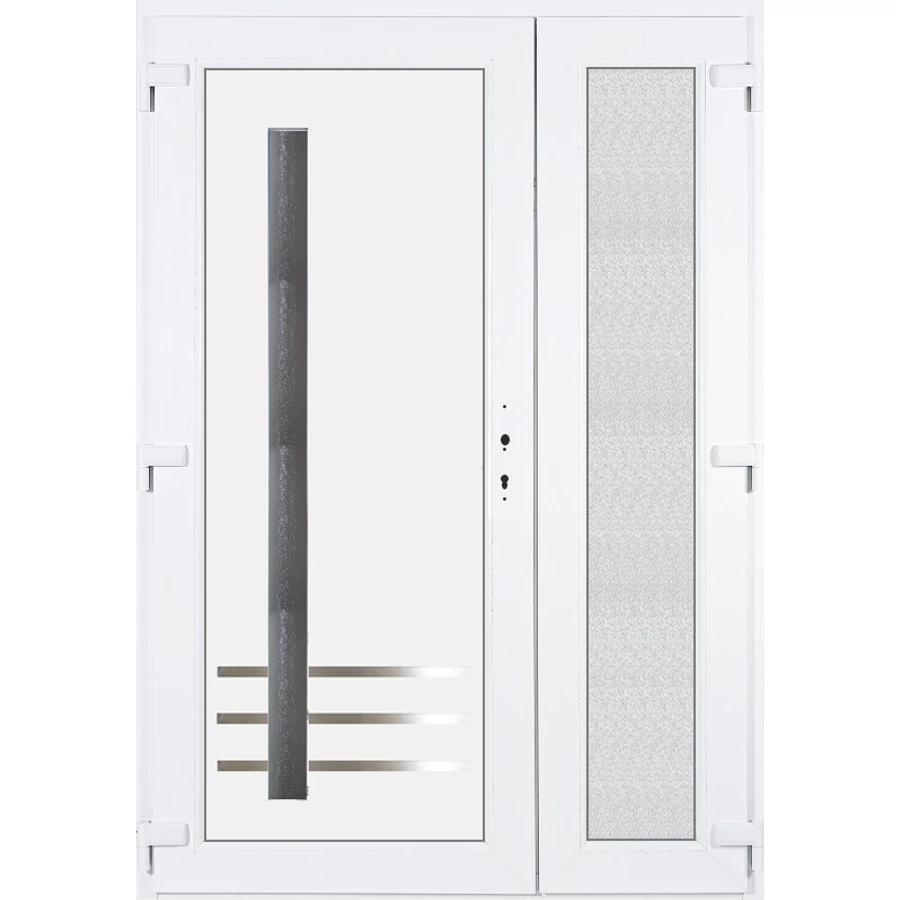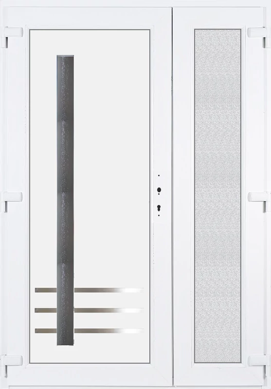 Kiváló hőszigetelésű műanyag bejárati ajtó 5 kamrás profilból, 70 mm beépítési mélységgel, tokban körbefutó idomacél merevítéssel. Vasalat: kilincsműködtetésű, 5 pontos ajtózárral, 3 db 3D erősített ajtópánttal, 35mm magas hőhídmentes alumínium küszöbbel. Dupla szürke ütközőtömítéssel rendelkezik. Üvegezése "GRÍZ" katedrál 2 rétegű Szuperlágybevonatos thermo üveg, 24 mm vastagságban, UG értéke: 1.0 W/m2K, a kisebb szárnyba végigfutó "GRÍZ" katedrál 2 rétegű Szuperlágybevonatos thermo üveg, 24 mm vastagságban kerül . A bejárati ajtó mindkét oldalán fehér színű. Nyitásmódja 2 szárnyú befelé nyíló, nyitásiránya balos ( bentről nézve a bal oldali a nagyobb nyíló szárny ). Tényleges tokkülmérete: 138 cm széles 208,5 cm magas. A nyílászáró ára nem tartalmazza a KILINCSET és a ZÁRBETÉTET a beszereléshez szükséges segédanyagokat (falkampó, csavar, pur-hab..stb.), külső-belső takaróléceket.