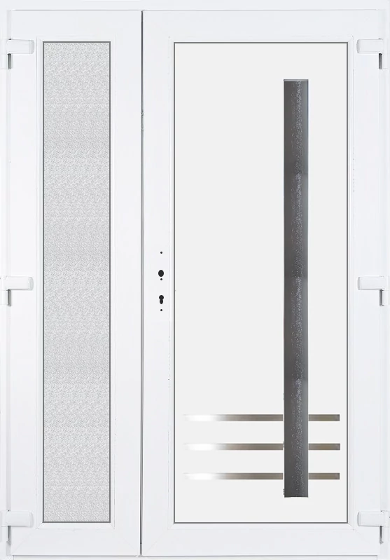 Kiváló hőszigetelésű műanyag bejárati ajtó 5 kamrás profilból, 70 mm beépítési mélységgel, tokban körbefutó idomacél merevítéssel. Vasalat: kilincsműködtetésű, 5 pontos ajtózárral, 3 db 3D erősített ajtópánttal, 35mm magas hőhídmentes alumínium küszöbbel. Dupla szürke ütközőtömítéssel rendelkezik. Üvegezése "GRÍZ" katedrál 2 rétegű Szuperlágybevonatos thermo üveg, 24 mm vastagságban, UG értéke: 1.0 W/m2K, a kisebb szárnyba végigfutó "GRÍZ" katedrál 2 rétegű Szuperlágybevonatos thermo üveg, 24 mm vastagságban kerül . A bejárati ajtó mindkét oldalán fehér színű. Nyitásmódja 2 szárnyú befelé nyíló, nyitásiránya jobbos ( bentről nézve a jobb oldali a nagyobb nyíló szárny ). Tényleges tokkülmérete: 138 cm széles 208,5 cm magas. A nyílászáró ára nem tartalmazza a KILINCSET és a ZÁRBETÉTET a beszereléshez szükséges segédanyagokat (falkampó, csavar, pur-hab..stb.), külső-belső takaróléceket.