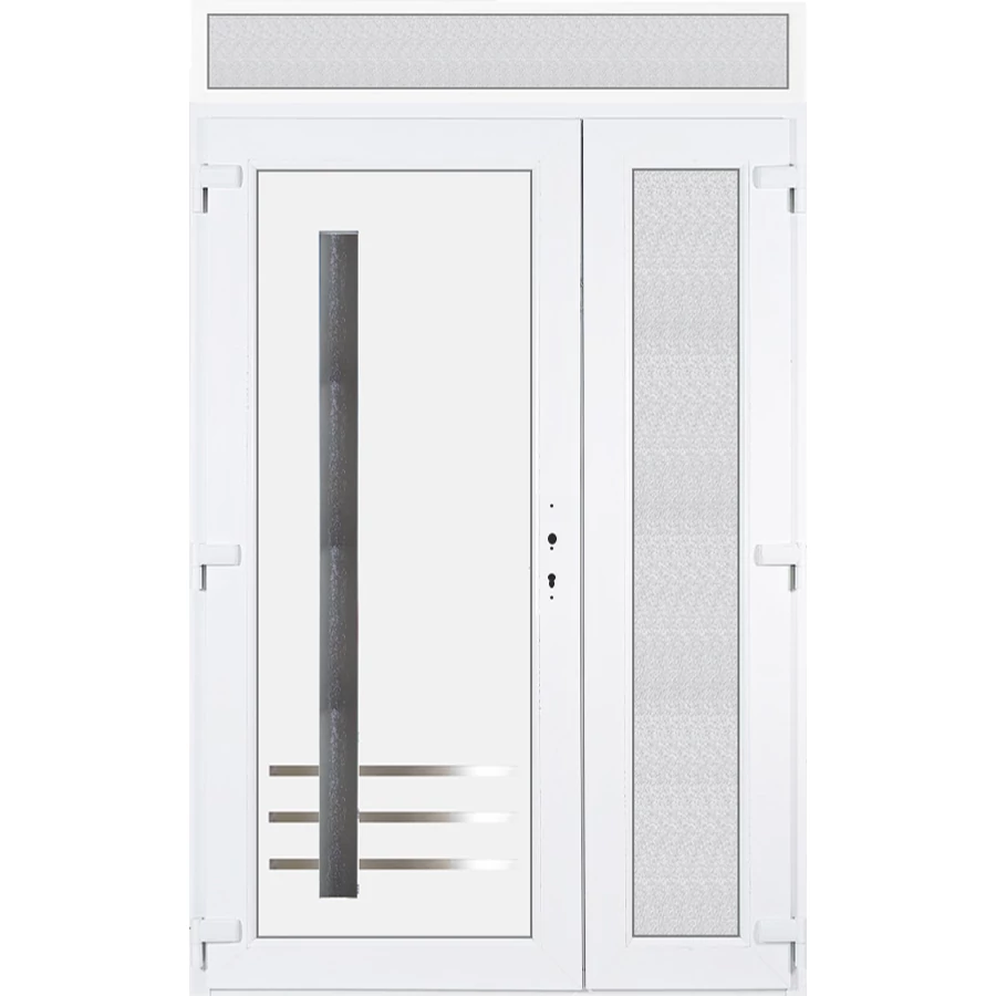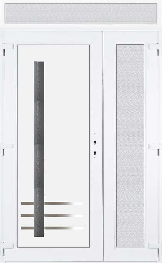 Kiváló hőszigetelésű műanyag bejárati ajtó 5 kamrás profilból, 70 mm beépítési mélységgel, tokban körbefutó idomacél merevítéssel. Vasalat: kilincsműködtetésű, 5 pontos ajtózárral, 3 db 3D erősített ajtópánttal, 35mm magas hőhídmentes alumínium küszöbbel. Dupla szürke ütközőtömítéssel rendelkezik. Üvegezése "GRÍZ" katedrál 2 rétegű Szuperlágybevonatos thermo üveg, 24 mm vastagságban, UG értéke: 1.0 W/m2K, a kisebb szárnyba végigfutó "GRÍZ" katedrál 2 rétegű Szuperlágybevonatos thermo üveg, 24 mm vastagságban kerül . A bejárati ajtó mindkét oldalán fehér színű. Nyitásmódja 2 szárnyú befelé nyíló, nyitásiránya balos ( bentről nézve a bal oldali a nagyobb nyíló szárny ). Tényleges tokkülmérete: 138 cm széles 238,5 cm magas. 138 cm széles 208,5 cm magas bejárati ajtóból, és egy138 cm széles 30 cm magas fix "GRÍZ" üvegezésű ( nem nyitható) felülvilágítóból áll. ( két külön elem ami beépítéskor összeszerelendő). A nyílászáró ára nem tartalmazza a KILINCSET és a ZÁRBETÉTET a beszereléshez szükséges segédanyagokat (falkampó, csavar, pur-hab..stb.), külső-belső takaróléceket.