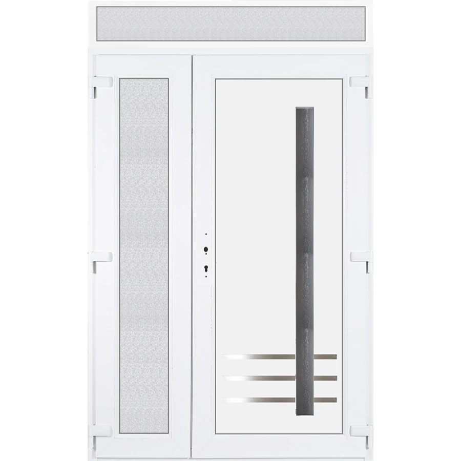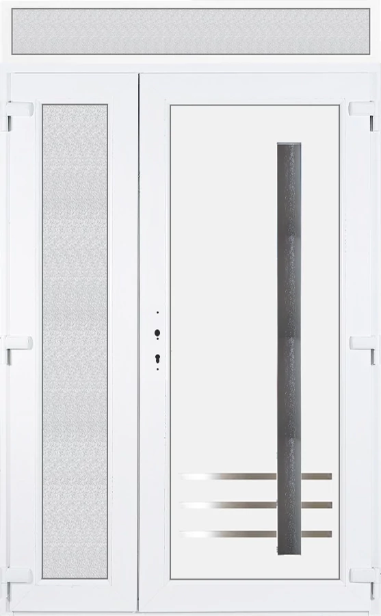 Kiváló hőszigetelésű műanyag bejárati ajtó 5 kamrás profilból, 70 mm beépítési mélységgel, tokban körbefutó idomacél merevítéssel. Vasalat: kilincsműködtetésű, 5 pontos ajtózárral, 3 db 3D erősített ajtópánttal, 35mm magas hőhídmentes alumínium küszöbbel. Dupla szürke ütközőtömítéssel rendelkezik. Üvegezése "GRÍZ" katedrál 2 rétegű Szuperlágybevonatos thermo üveg, 24 mm vastagságban, UG értéke: 1.0 W/m2K, a kisebb szárnyba végigfutó "GRÍZ" katedrál 2 rétegű Szuperlágybevonatos thermo üveg, 24 mm vastagságban kerül . A bejárati ajtó mindkét oldalán fehér színű. Nyitásmódja 2 szárnyú befelé nyíló, nyitásiránya jobbos ( bentről nézve a jobb oldali a nagyobb nyíló szárny ). Tényleges tokkülmérete: 138 cm széles 238,5 cm magas. 138 cm széles 208,5 cm magas bejárati ajtóból, és egy138 cm széles 30 cm magas fix "GRÍZ" üvegezésű ( nem nyitható) felülvilágítóból áll. ( két külön elem ami beépítéskor összeszerelendő). A nyílászáró ára nem tartalmazza a KILINCSET és a ZÁRBETÉTET a beszereléshez szükséges segédanyagokat (falkampó, csavar, pur-hab..stb.), külső-belső takaróléceket.