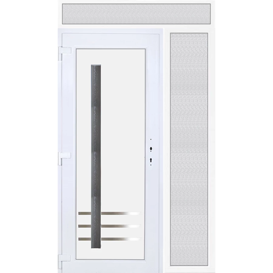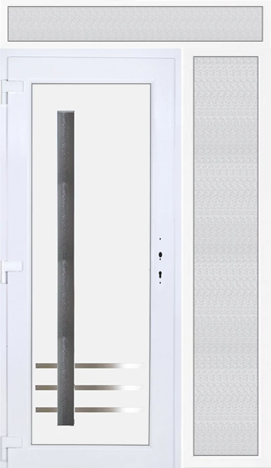 Kiváló hőszigetelésű műanyag bejárati ajtó 5 kamrás profilból, 70 mm beépítési mélységgel, tokban körbefutó idomacél merevítéssel. Vasalat: kilincsműködtetésű, 5 pontos ajtózárral, 3 db 3D erősített ajtópánttal, 35mm magas hőhídmentes alumínium küszöbbel. Dupla szürke ütközőtömítéssel rendelkezik. Üvegezése "GRÍZ" katedrál 2 rétegű Szuperlágybevonatos thermo üveg, 24 mm vastagságban, UG értéke: 1.0 W/m2K . A bejárati ajtó mindkét oldalán fehér színű. Nyitásmódja befelé nyíló, nyitásiránya balos ( bentről nézve a zsanér a bal oldalon helyezkedik el ). Tényleges tokkülmérete: 138 cm széles 238,5 cm magas. 98 cm széles 208,5 cm magas bejárati ajtóból,40 cm széles 208,5 cm magas fix "GRÍZ" üvegezésű ( nem nyitható) oldalvilágítóból és egy 138 cm széles 30 cm magas fix "GRÍZ" üvegezésű ( nem nyitható) felülvilágítóból áll. ( három külön elem ami beépítéskor összeszerelendő). A nyílászáró ára nem tartalmazza a KILINCSET és a ZÁRBETÉTET a beszereléshez szükséges segédanyagokat (falkampó, csavar, pur-hab..stb.), külső-belső takaróléceket.
