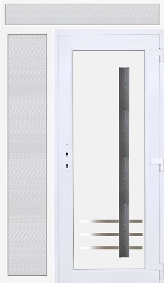 Kiváló hőszigetelésű műanyag bejárati ajtó 5 kamrás profilból, 70 mm beépítési mélységgel, tokban körbefutó idomacél merevítéssel. Vasalat: kilincsműködtetésű, 5 pontos ajtózárral, 3 db 3D erősített ajtópánttal, 35mm magas hőhídmentes alumínium küszöbbel. Dupla szürke ütközőtömítéssel rendelkezik. Üvegezése "GRÍZ" katedrál 2 rétegű Szuperlágybevonatos thermo üveg, 24 mm vastagságban, UG értéke: 1.0 W/m2K . A bejárati ajtó mindkét oldalán fehér színű. Nyitásmódja befelé nyíló, nyitásiránya jobbos ( bentről nézve a zsanér a jobb oldalon helyezkedik el ). Tényleges tokkülmérete: 138 cm széles 238,5 cm magas. 98 cm széles 208,5 cm magas bejárati ajtóból,40 cm széles 208,5 cm magas fix "GRÍZ" üvegezésű ( nem nyitható) oldalvilágítóból és egy 138 cm széles 30 cm magas fix "GRÍZ" üvegezésű ( nem nyitható) felülvilágítóból áll. ( három külön elem ami beépítéskor összeszerelendő). A nyílászáró ára nem tartalmazza a KILINCSET és a ZÁRBETÉTET a beszereléshez szükséges segédanyagokat (falkampó, csavar, pur-hab..stb.), külső-belső takaróléceket.