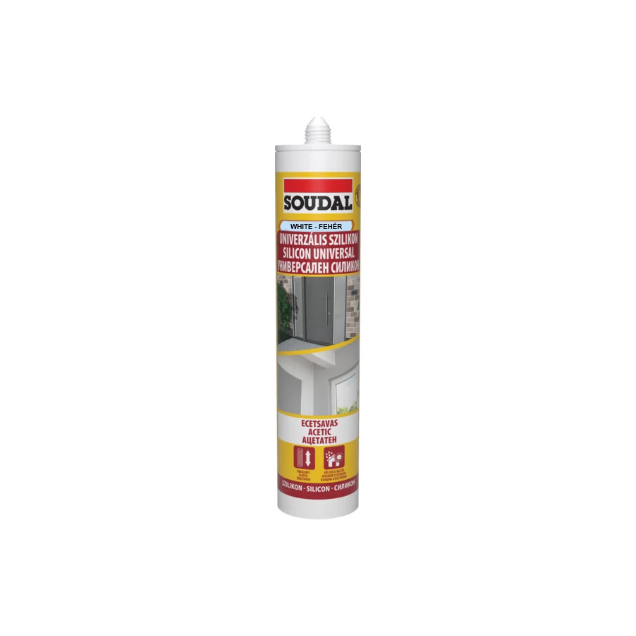 Univerzális szilikon.Ecetsavas univerzális építőipari szilikon, tömítésre és réskitöltésre, kerámia, üveg, fém csatlakozási pontokhoz, hagyományos építőanyagokhoz.Jellemzők:Kiváló tapadás a szokásos porózus anyagokhoz: beton, tégla, fa, és nem porózus anyagokhoz: üveg, kerámia, mázas felületek, számos fém, stb..Kötés után tartósan rugalmas és ellenáll az időjárás hatásainak.Felhasználás:Csatlakozási felületek tömítésére, építmények és egyéb szerkezetek illeszkedési pontjaihoz.Fugázáshoz, kerámia padlóhoz, kül és beltéren.Átmeneti üveg rögzítéshez (nem kezelt,festett keretekhez).Hűtő és szellőző berendezésekhez, konténer gyártásban is.Nem alkalmas PVC, akril anyagokhoz és néhány korrozív fémhez! Fehér színű !