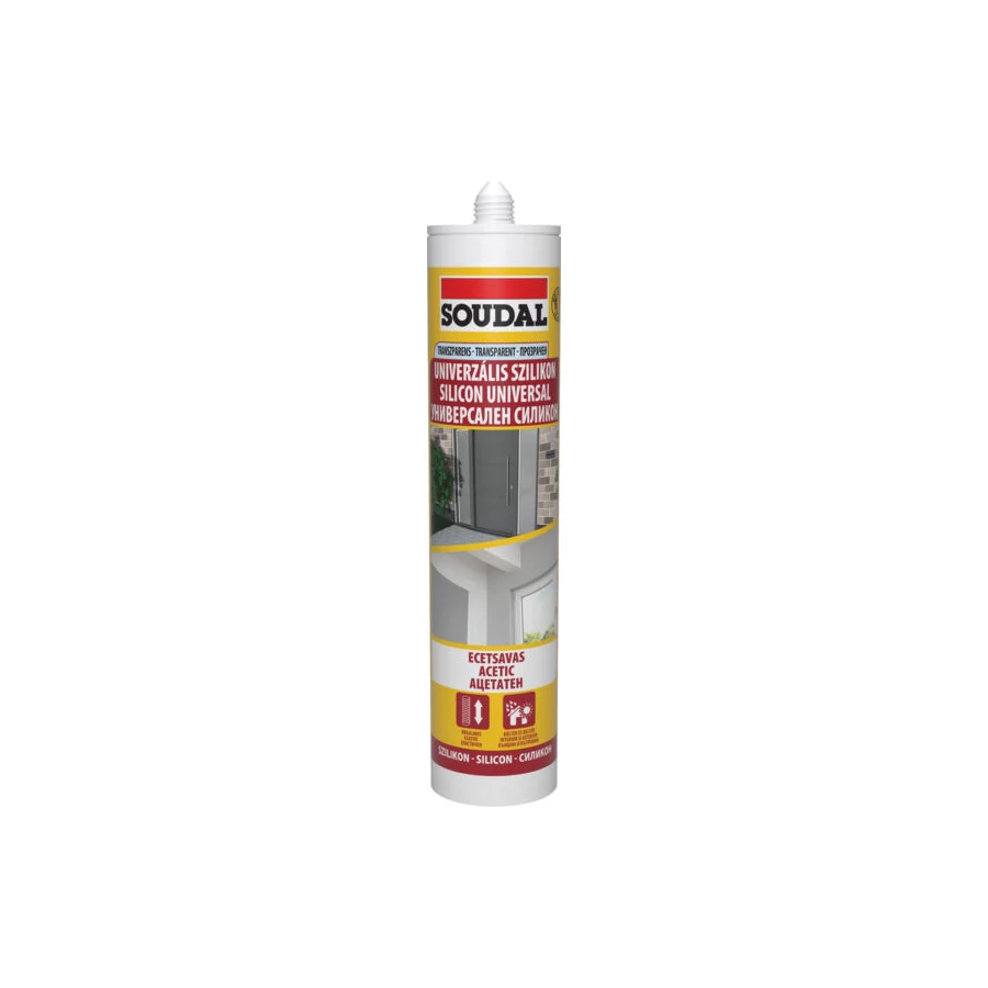 Univerzális szilikon.Ecetsavas univerzális építőipari szilikon, tömítésre és réskitöltésre, kerámia, üveg, fém csatlakozási pontokhoz, hagyományos építőanyagokhoz.Jellemzők:Kiváló tapadás a szokásos porózus anyagokhoz: beton, tégla, fa, és nem porózus anyagokhoz: üveg, kerámia, mázas felületek, számos fém, stb..Kötés után tartósan rugalmas és ellenáll az időjárás hatásainak.Felhasználás:Csatlakozási felületek tömítésére, építmények és egyéb szerkezetek illeszkedési pontjaihoz.Fugázáshoz, kerámia padlóhoz, kül és beltéren.Átmeneti üveg rögzítéshez (nem kezelt,festett keretekhez).Hűtő és szellőző berendezésekhez, konténer gyártásban is.Nem alkalmas PVC, akril anyagokhoz és néhány korrozív fémhez! Színtelen !